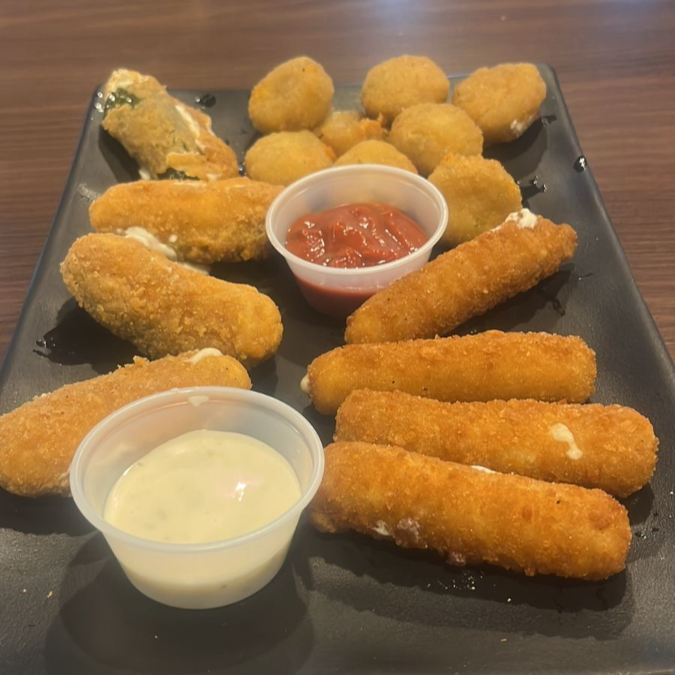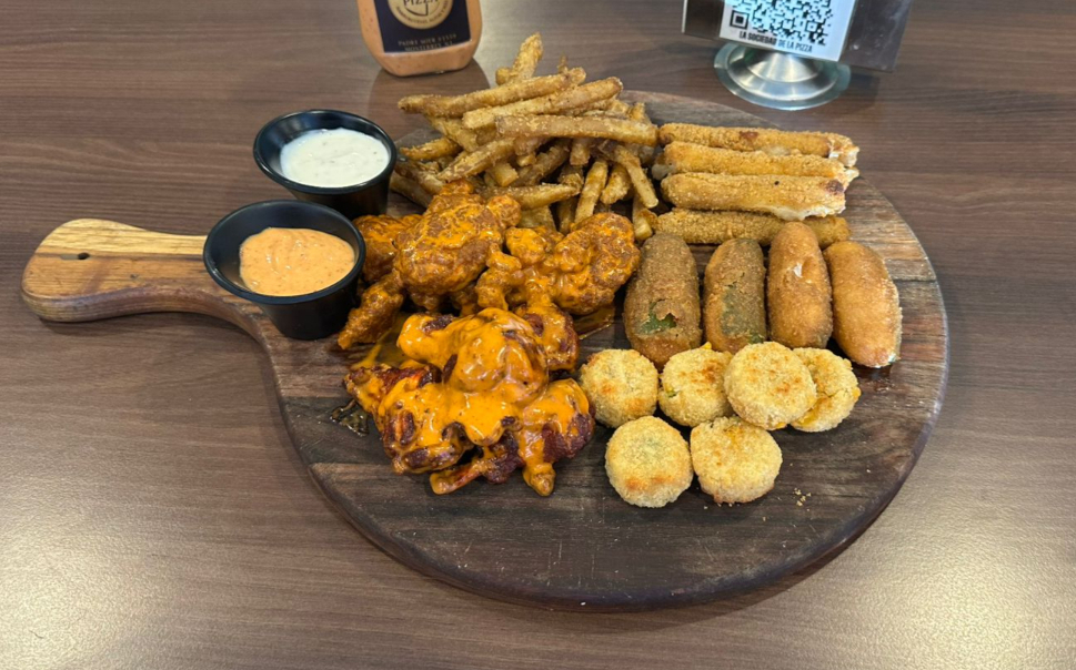 La torre de snacks para compartir: 400g alitas, 200g de boneless, 4 jalapeños rellenos, 10 papas muncher, 6 dedos de queso, 150g papas bañadas o naturales.