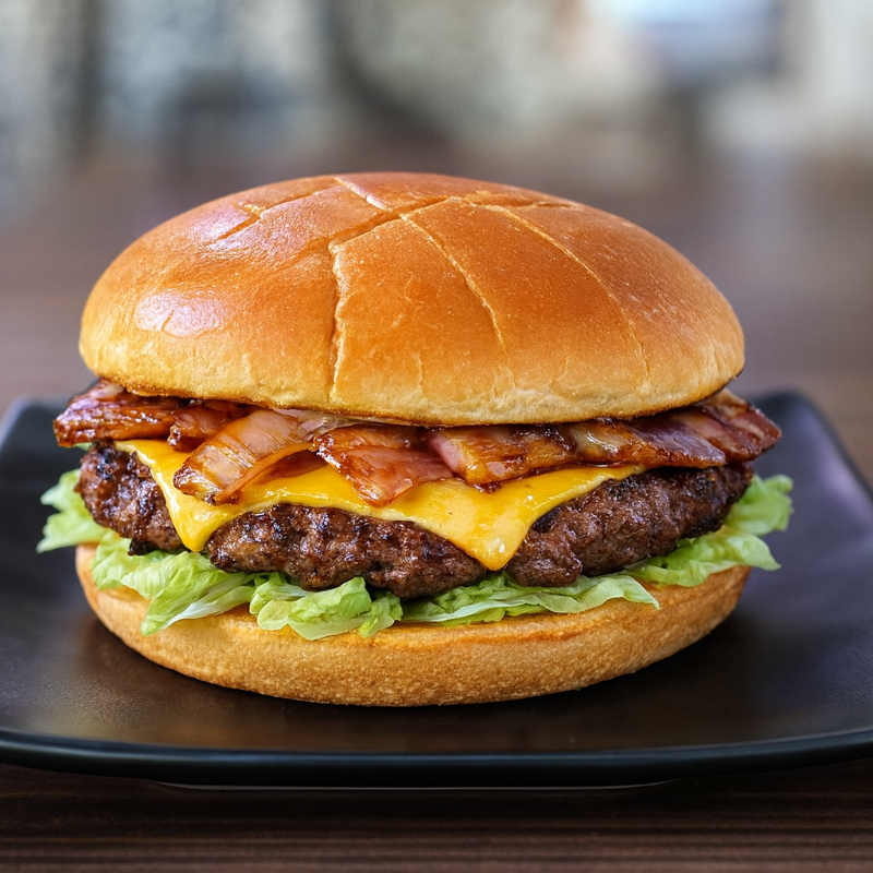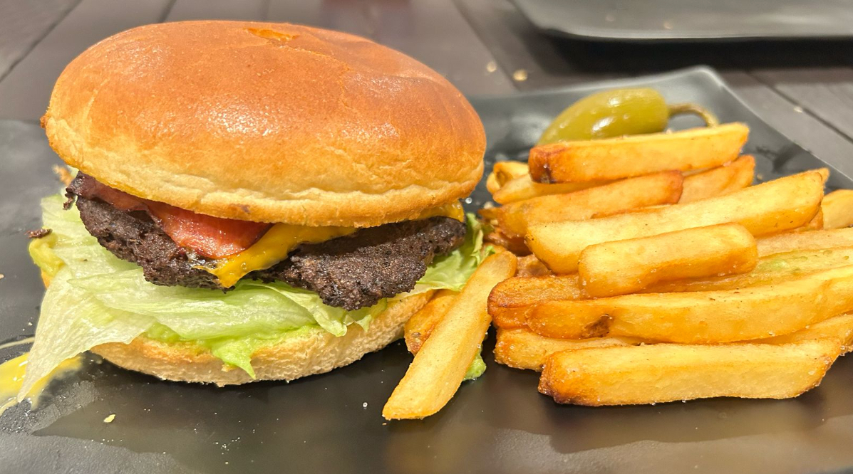 Sabor a rancho en cada mordida. Carne Premium de res 150gr, Tocino, pan parrillero, aderezo, queso americano, gouda, jamón, lechuga, tomate y Cebolla.