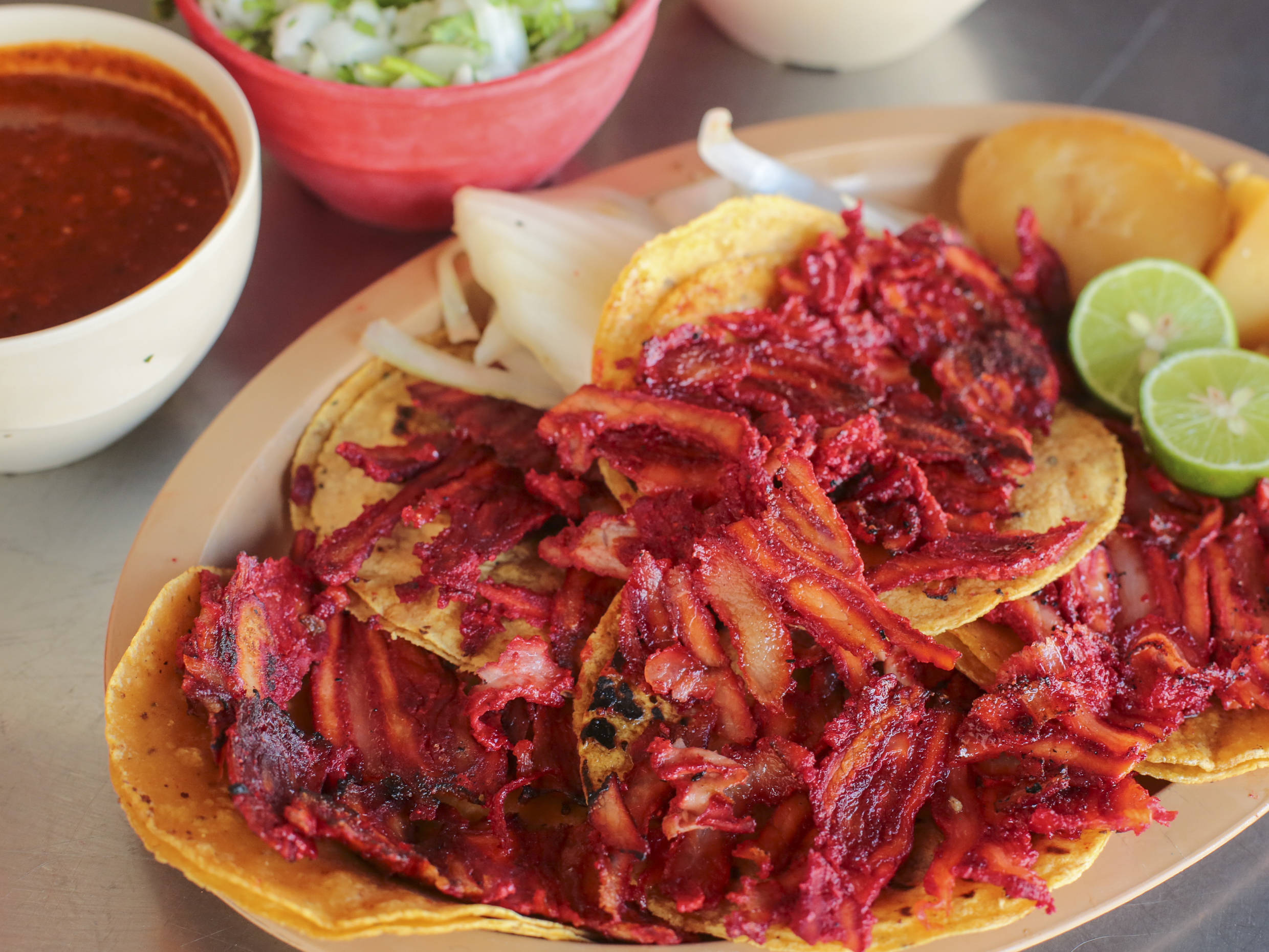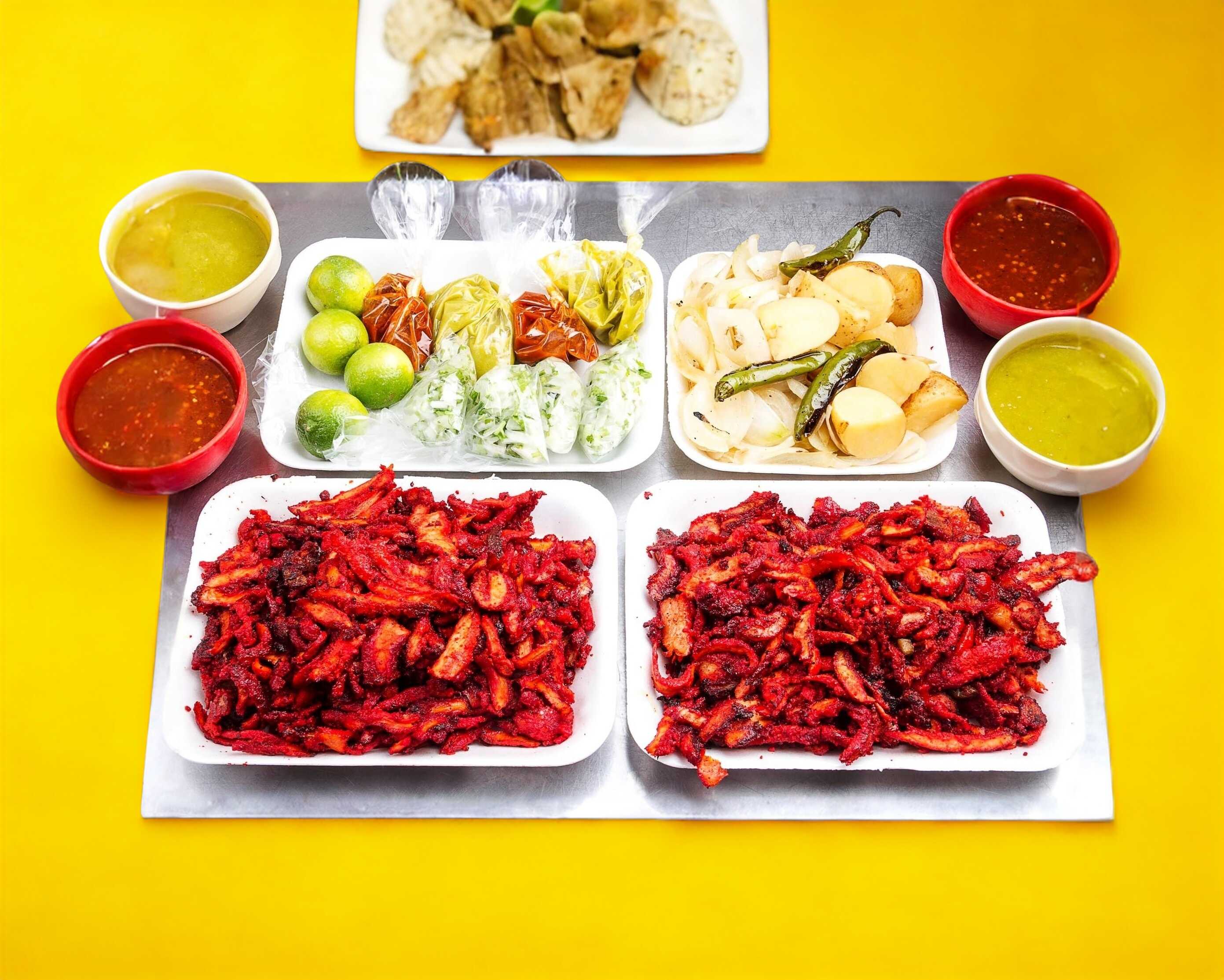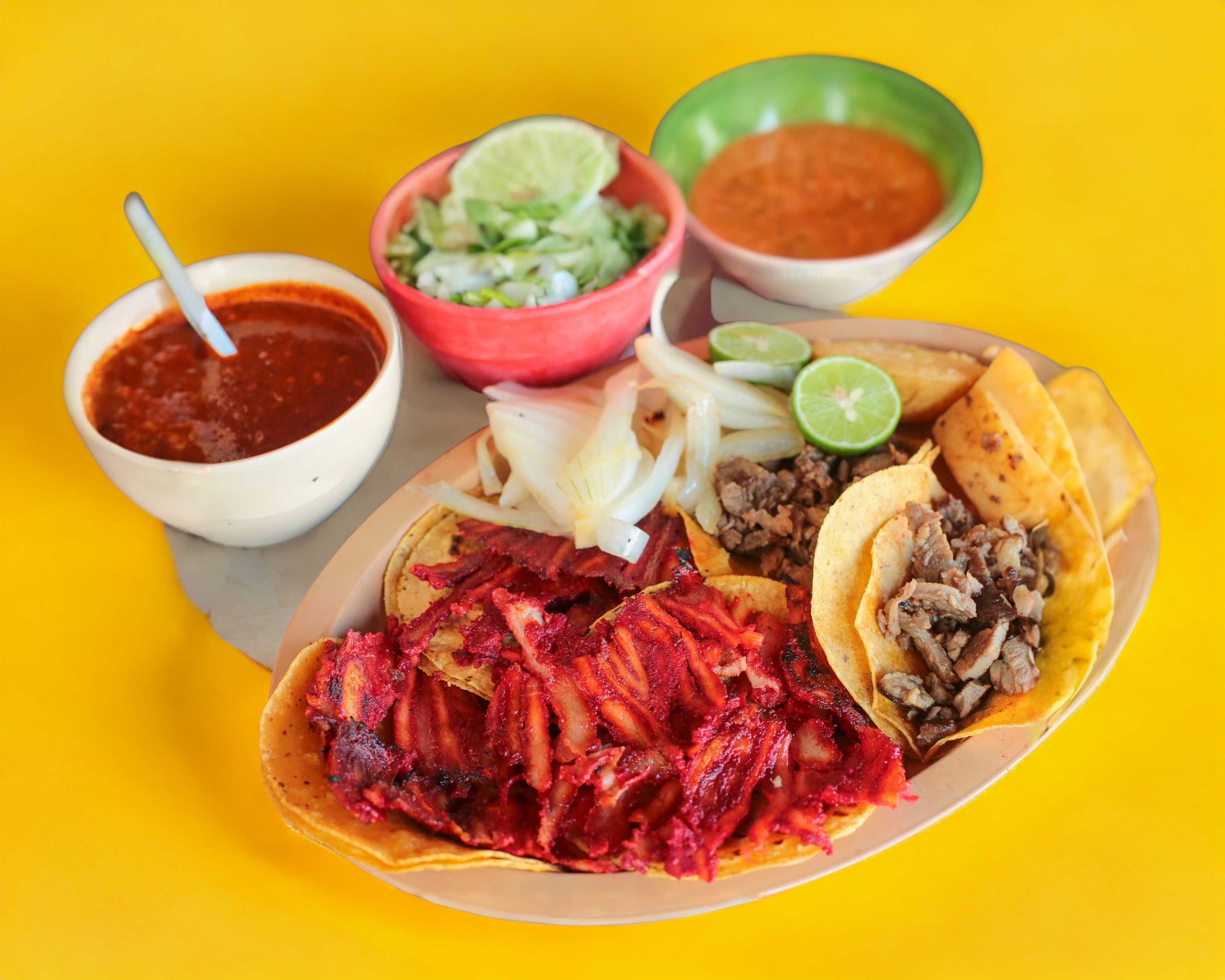 3 de trompo, 2 de bistec, salsa verde o roja según disponibilidad, cebolla y limones.