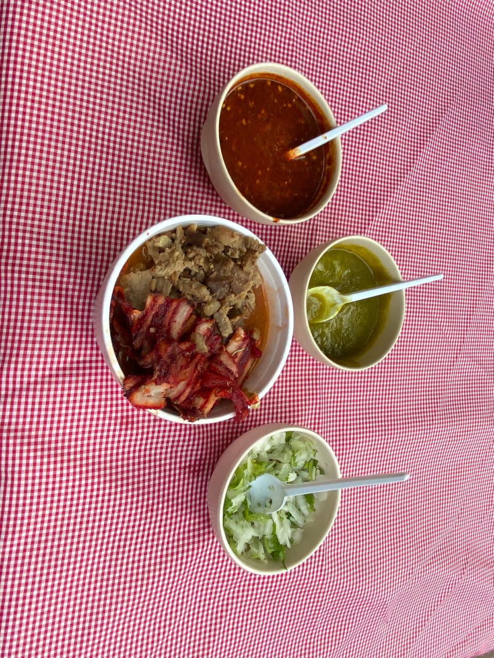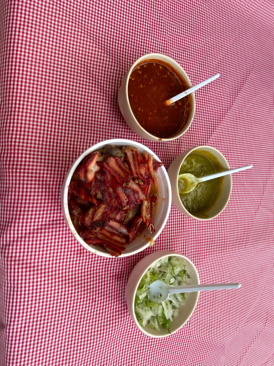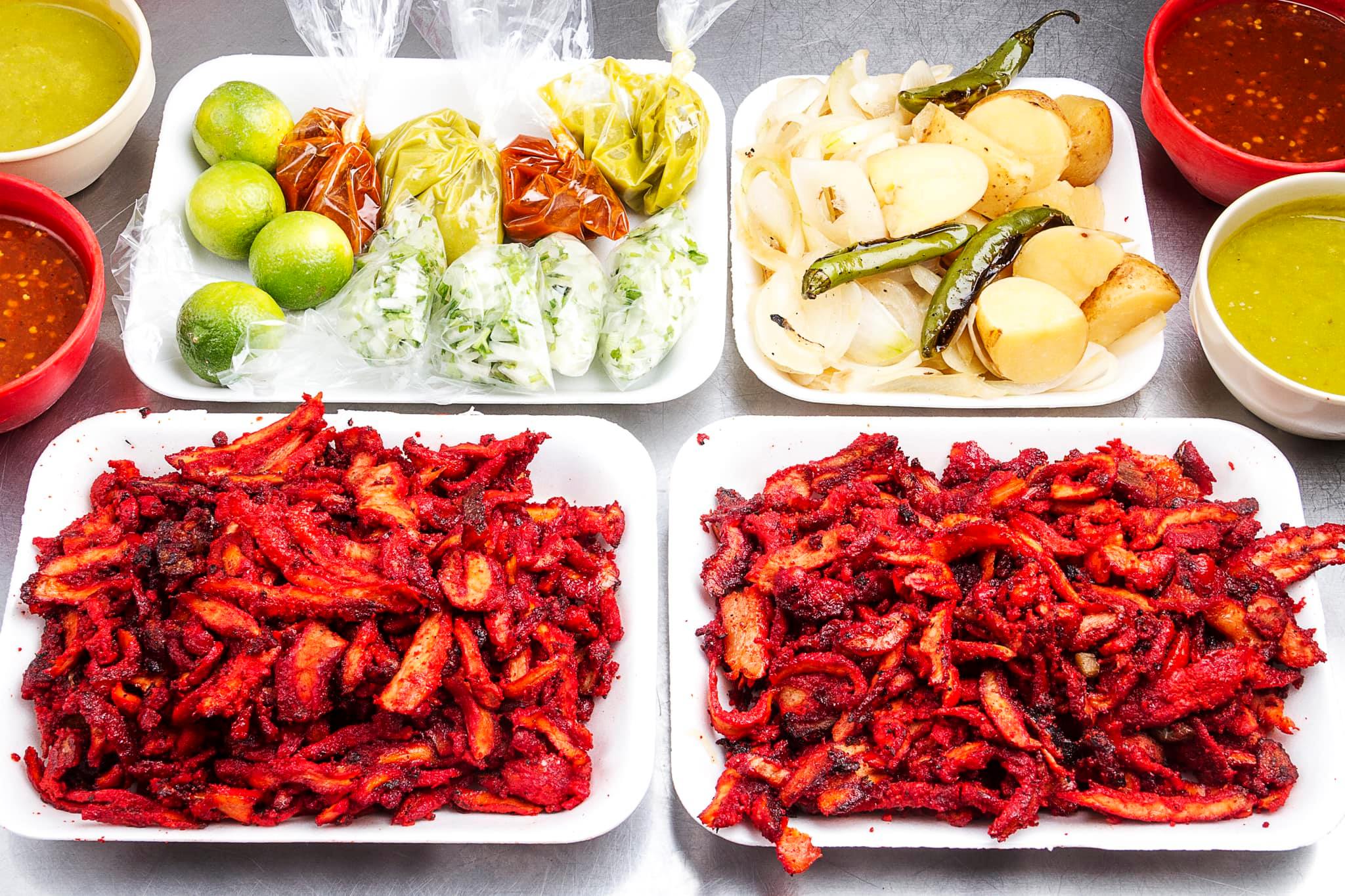 3 de trompo, 2 de bistec, salsa verde o roja según disponibilidad, cebolla y limones.