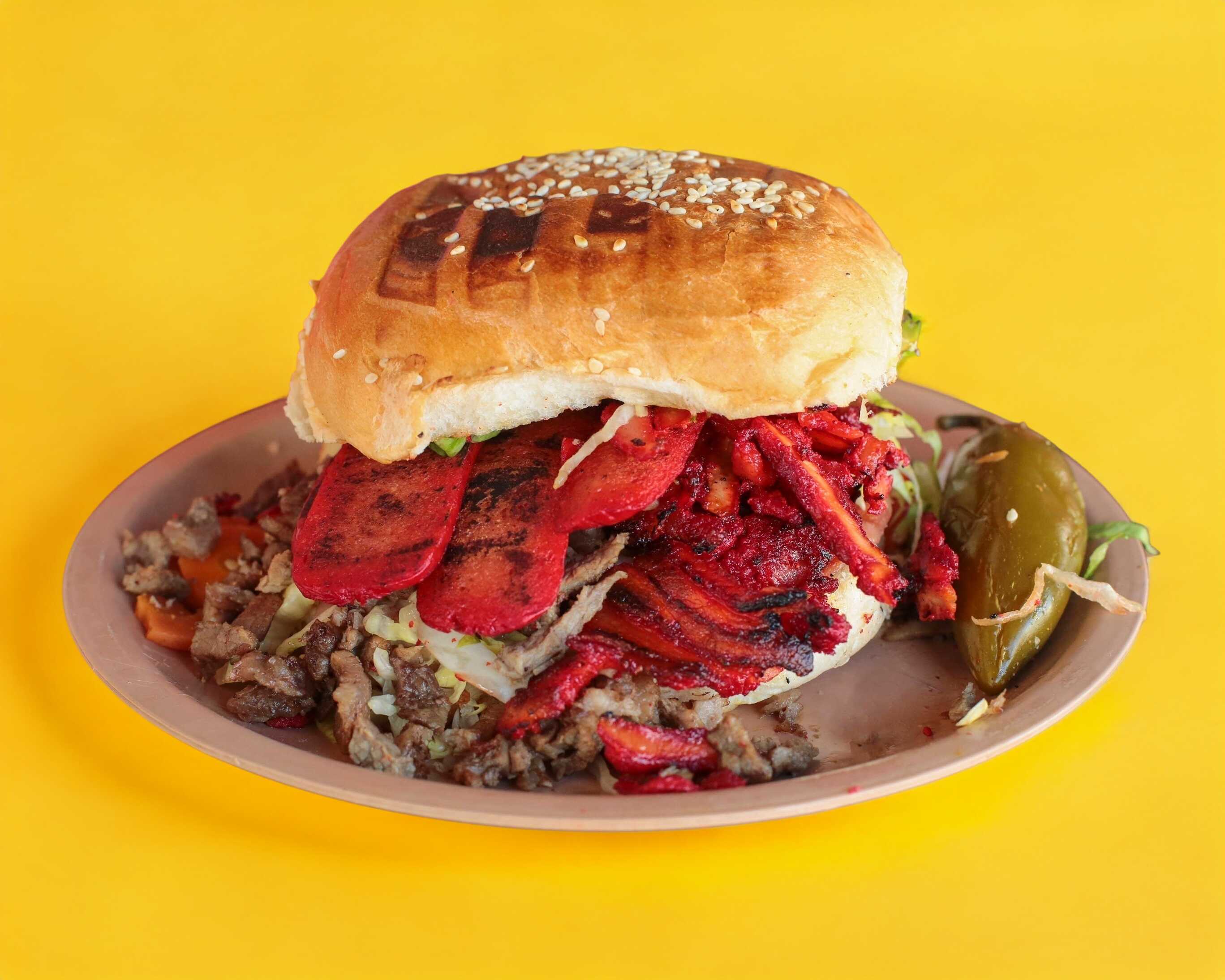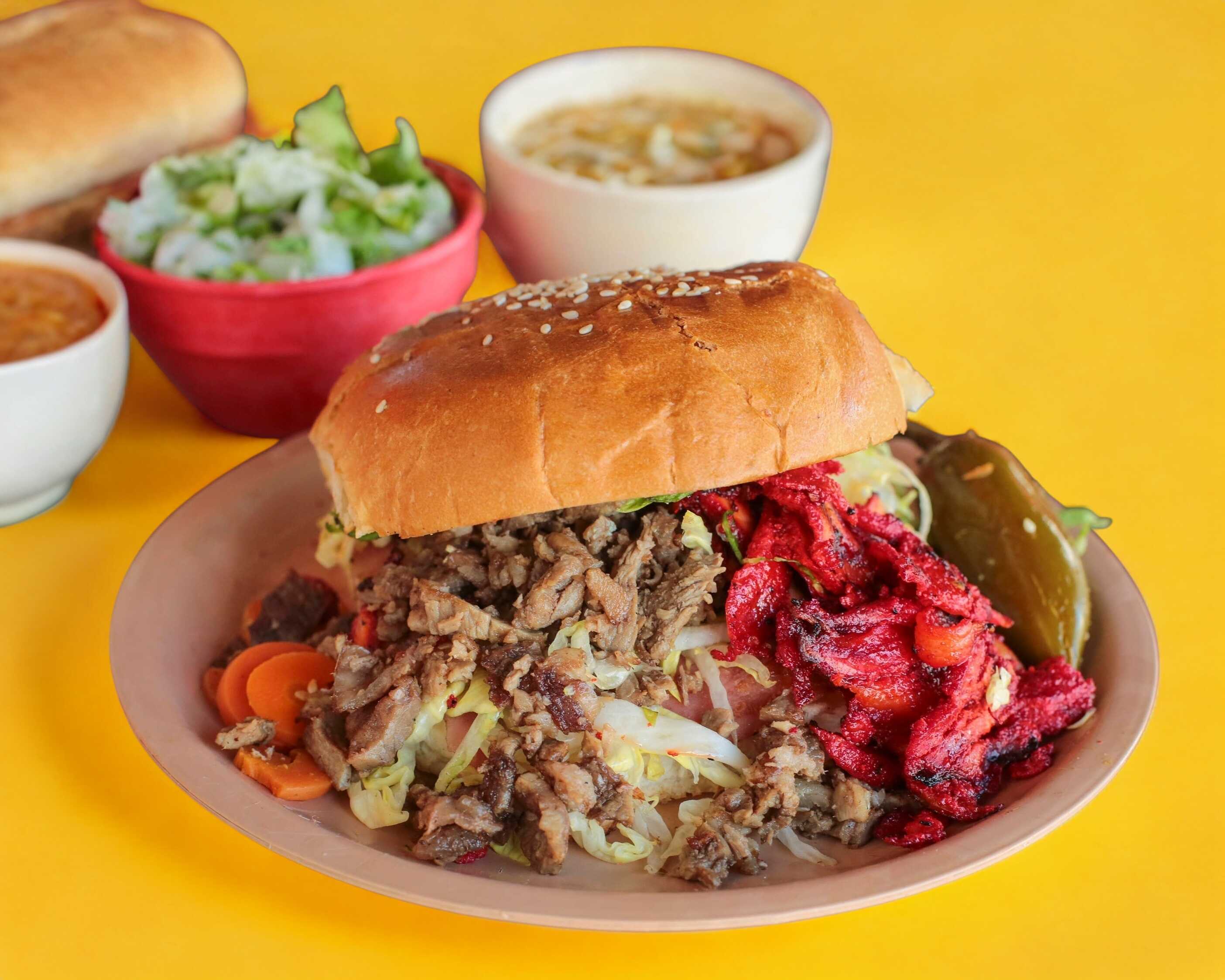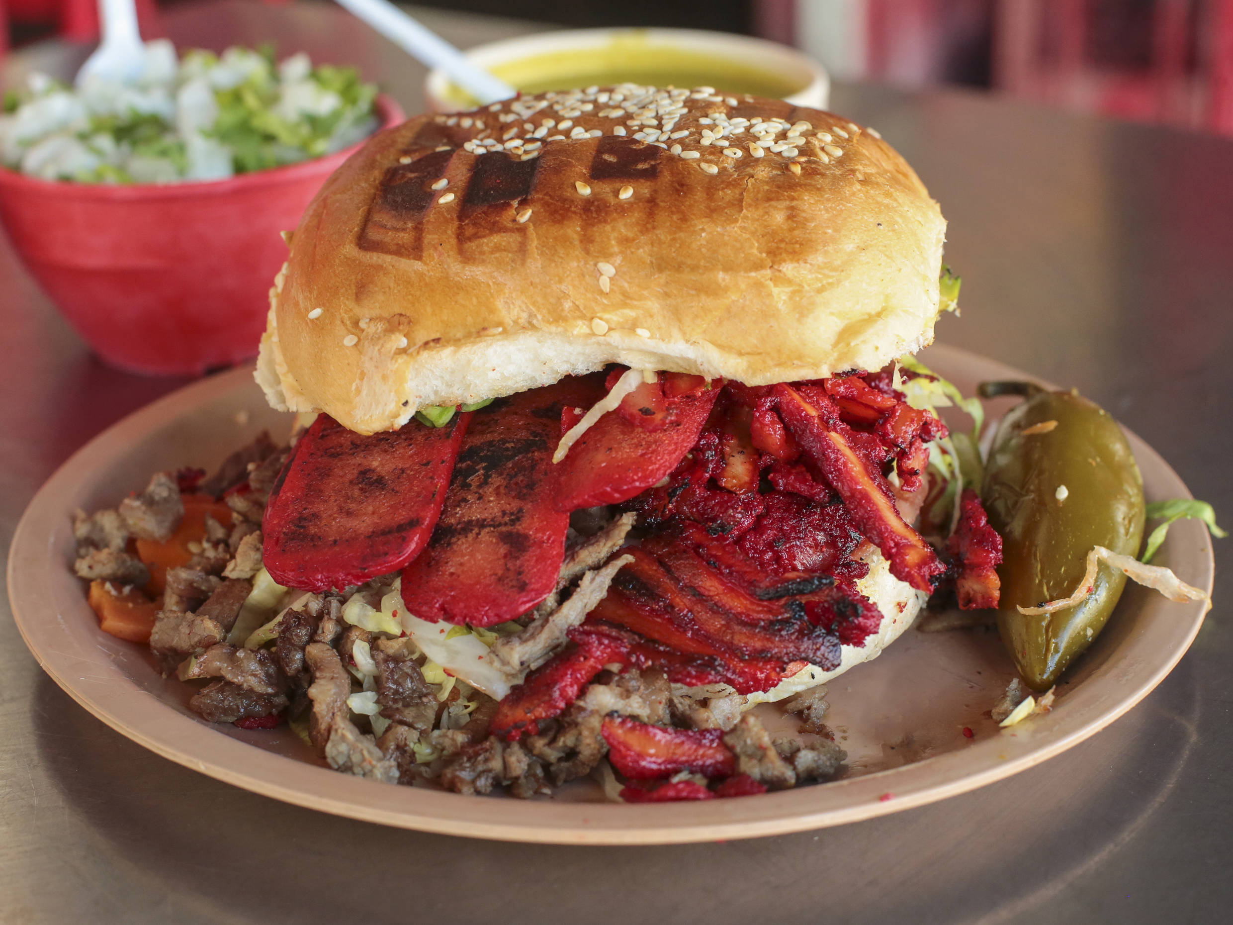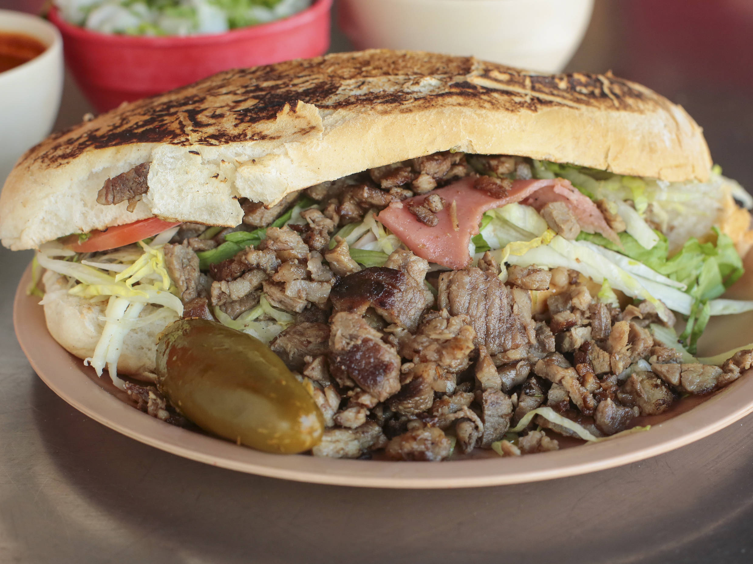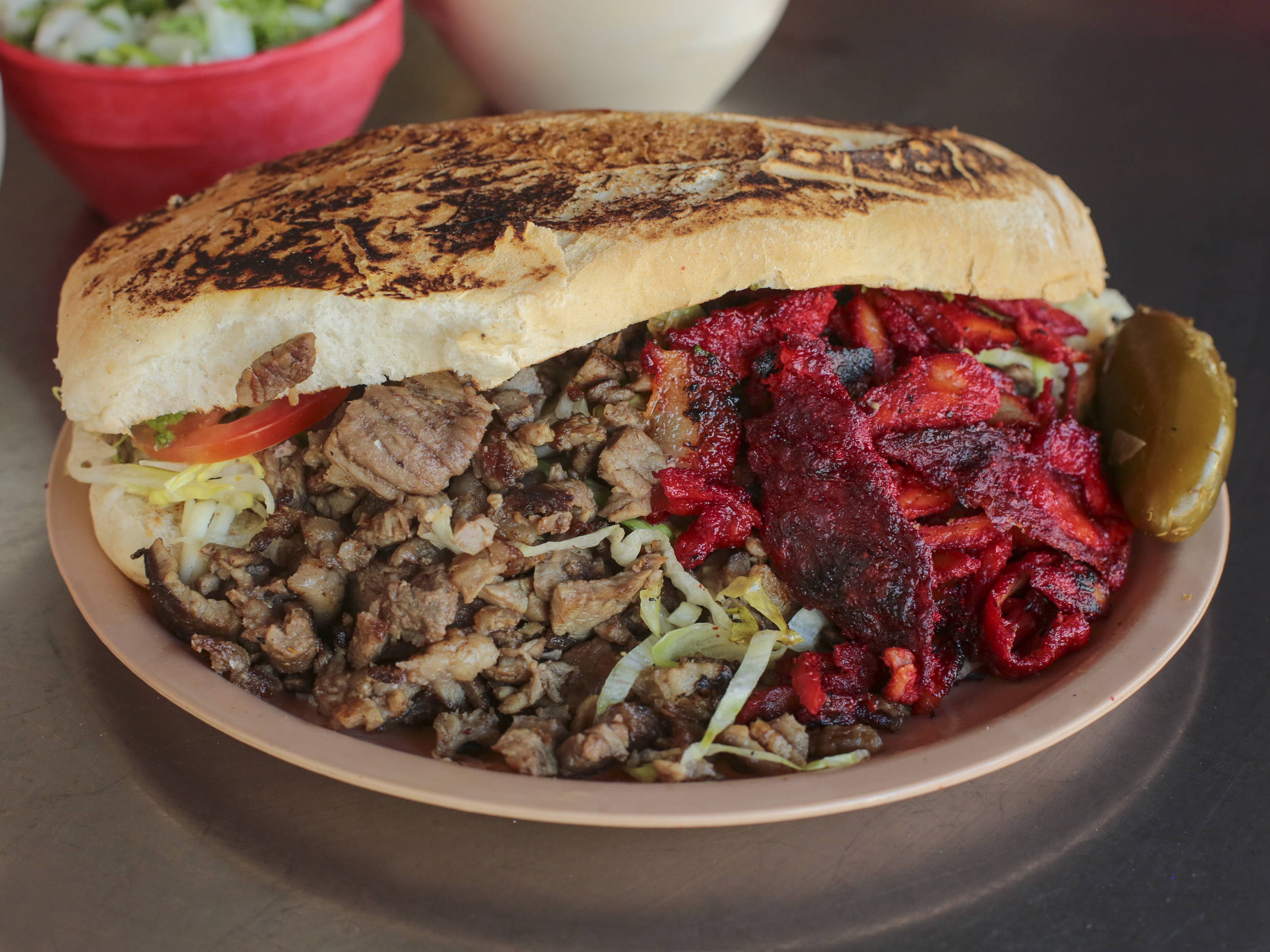 Pan telera, carne de trompo y bisteck, tomate, lechuga, crema, aguacate y mayonesa.