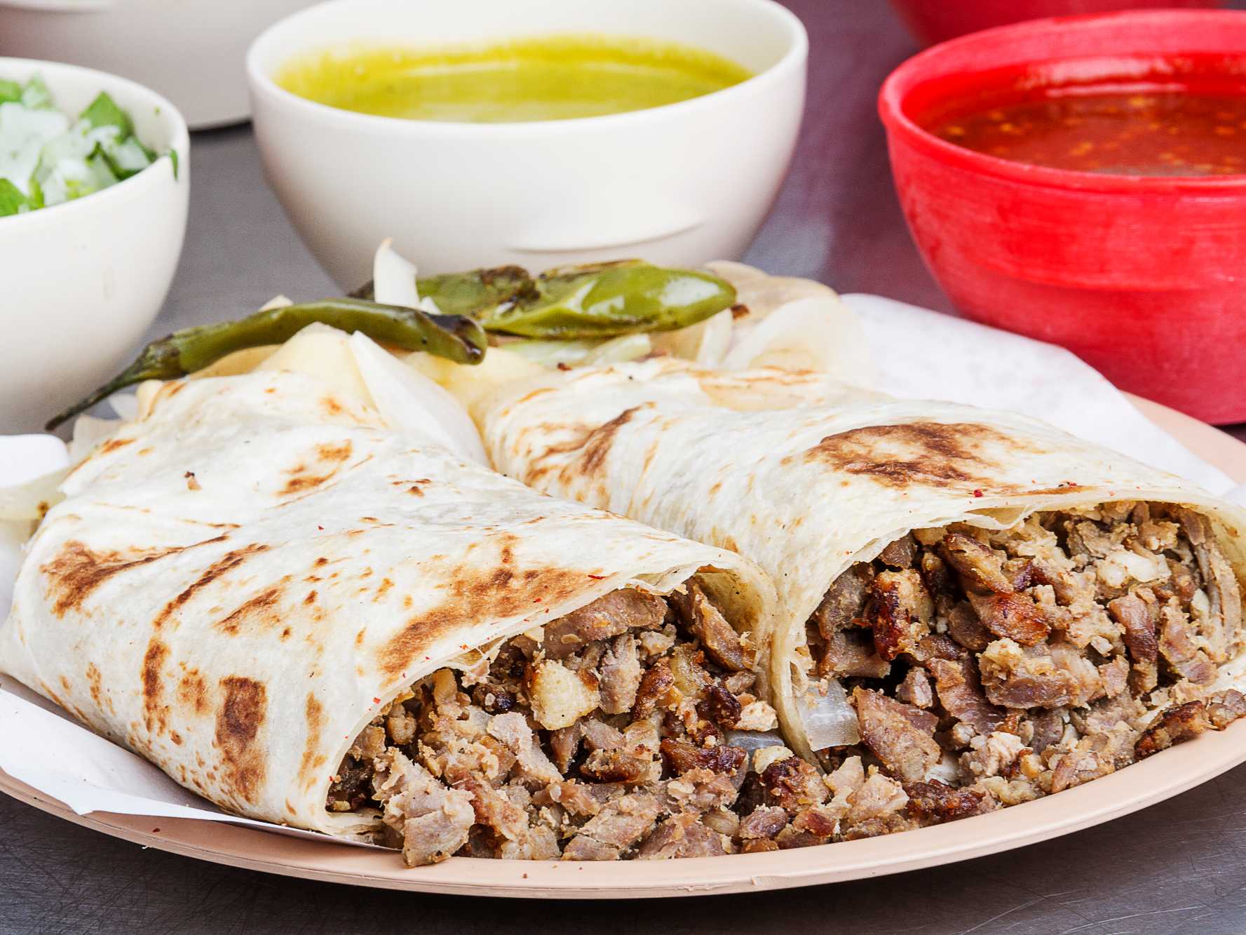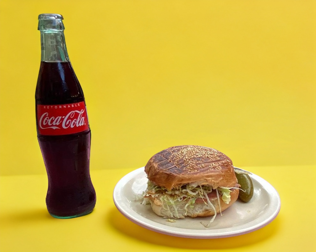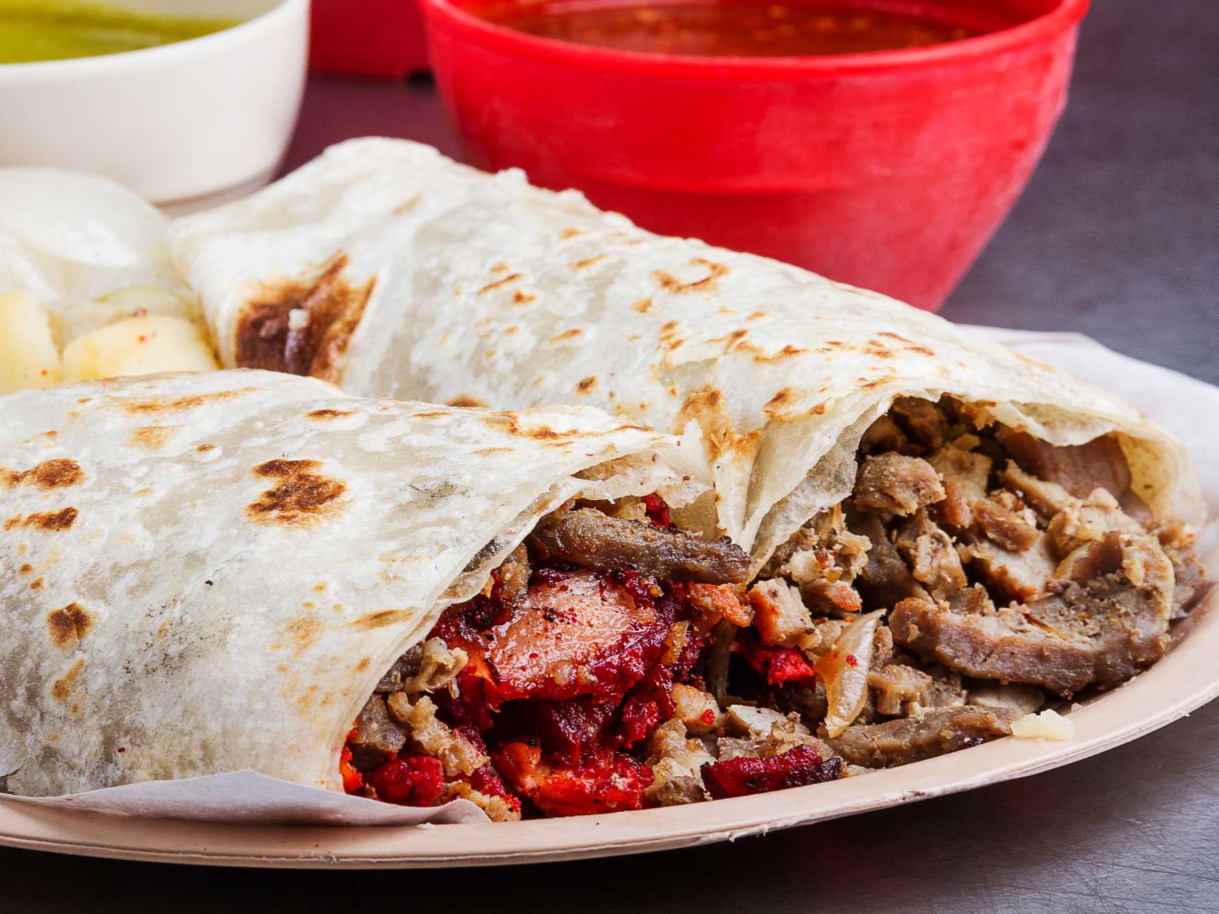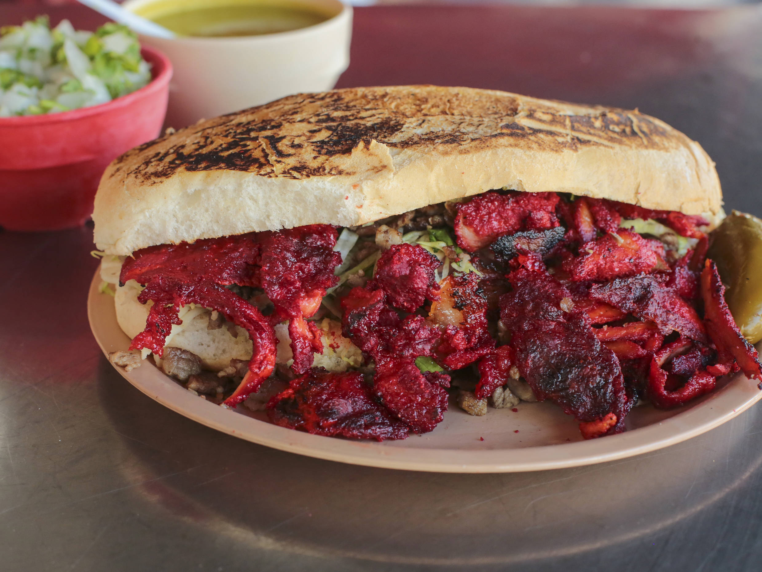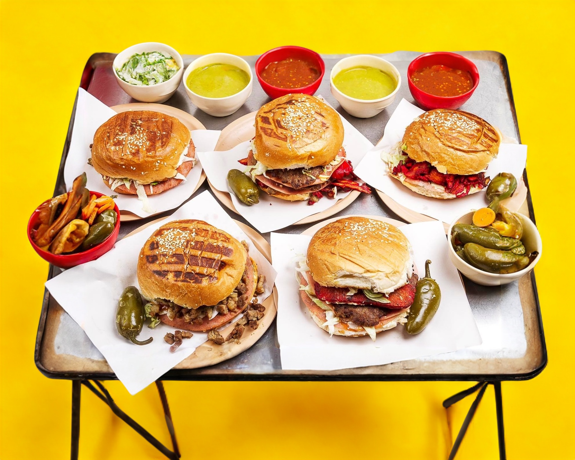 Pan telera, carne de trompo y bisteck, tomate, lechuga, crema, aguacate y mayonesa.