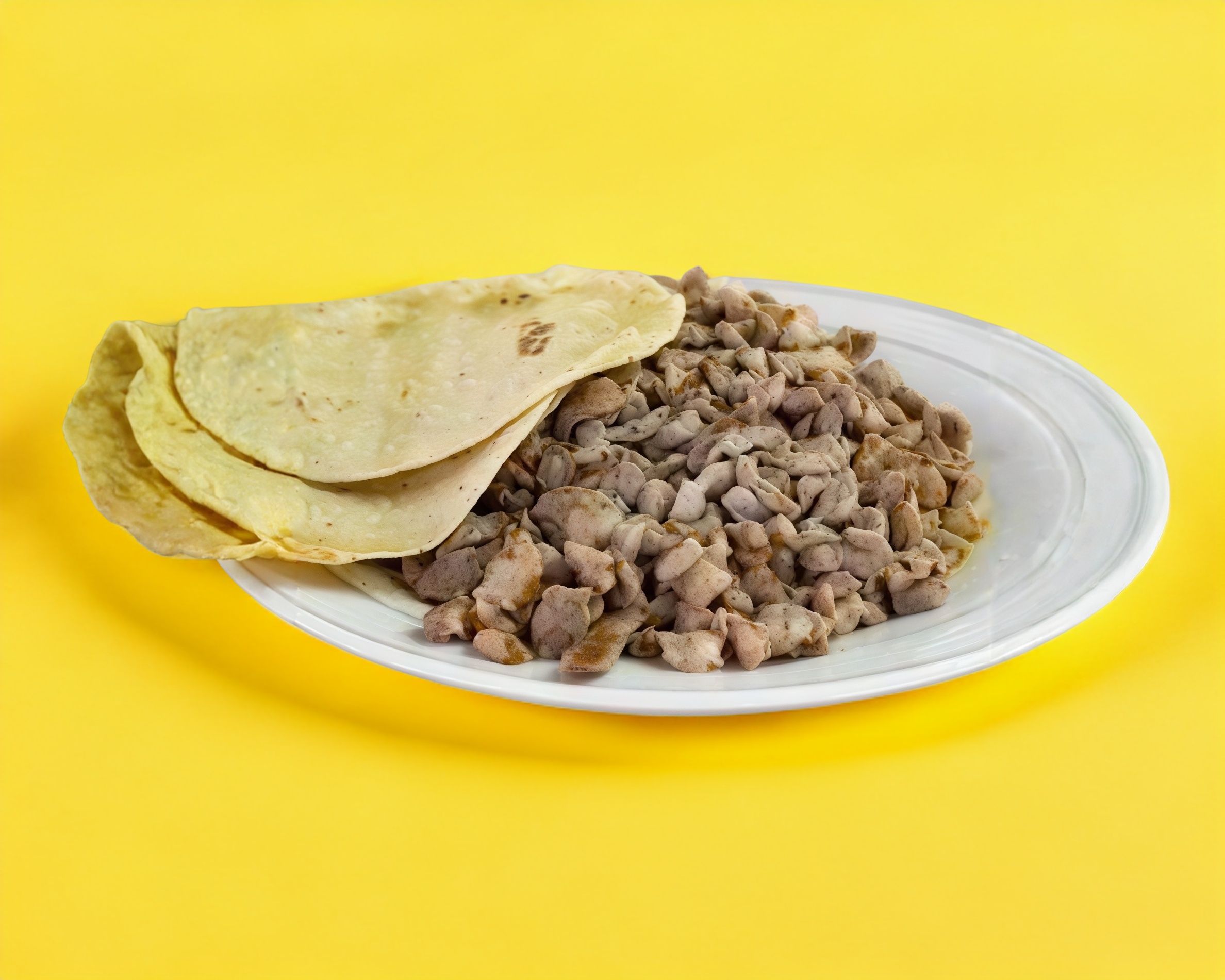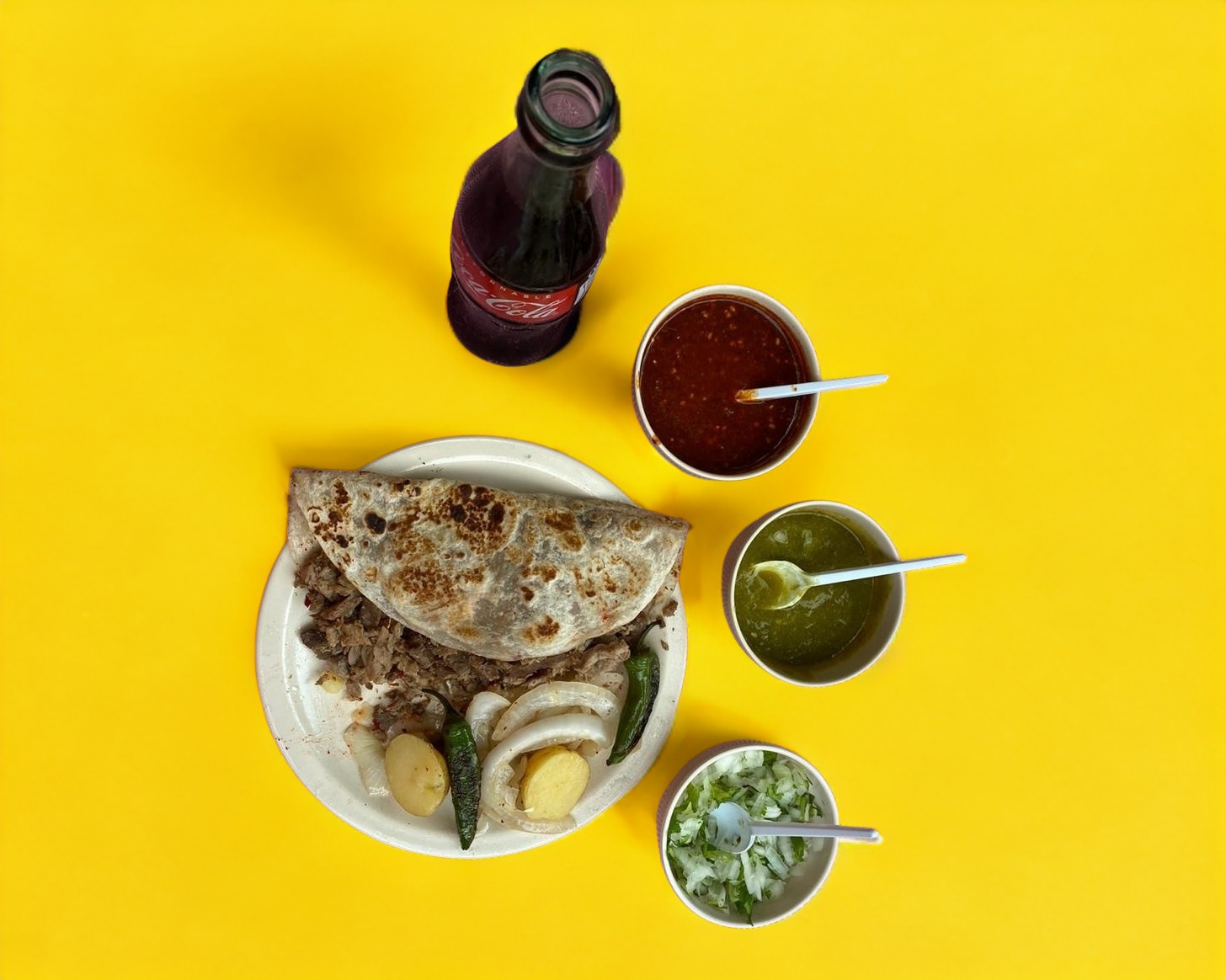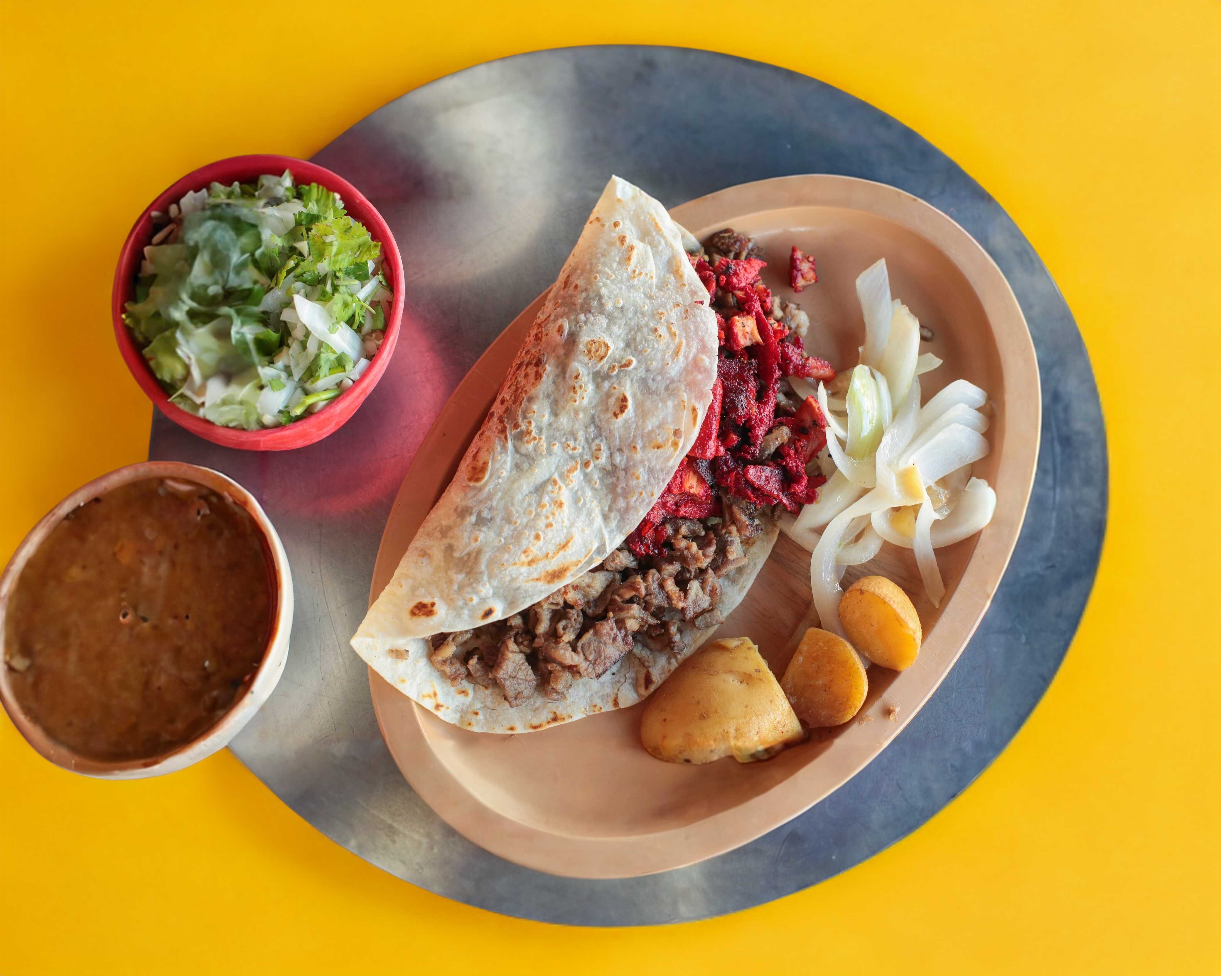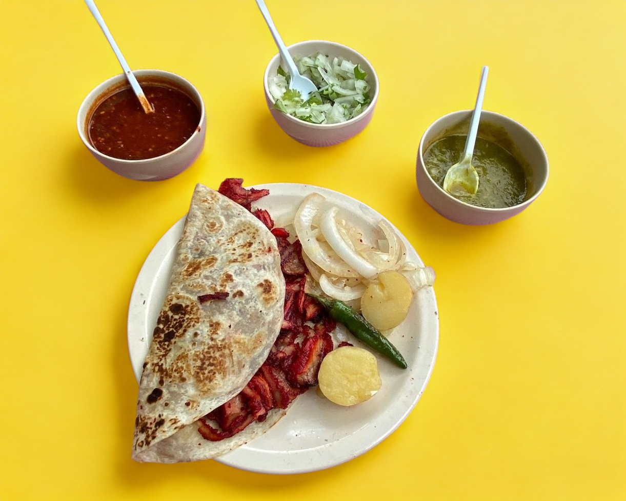 1 Pirata tortilla de harina mediana, queso de asadero, carne de bistec, cebolla, salsa, limones