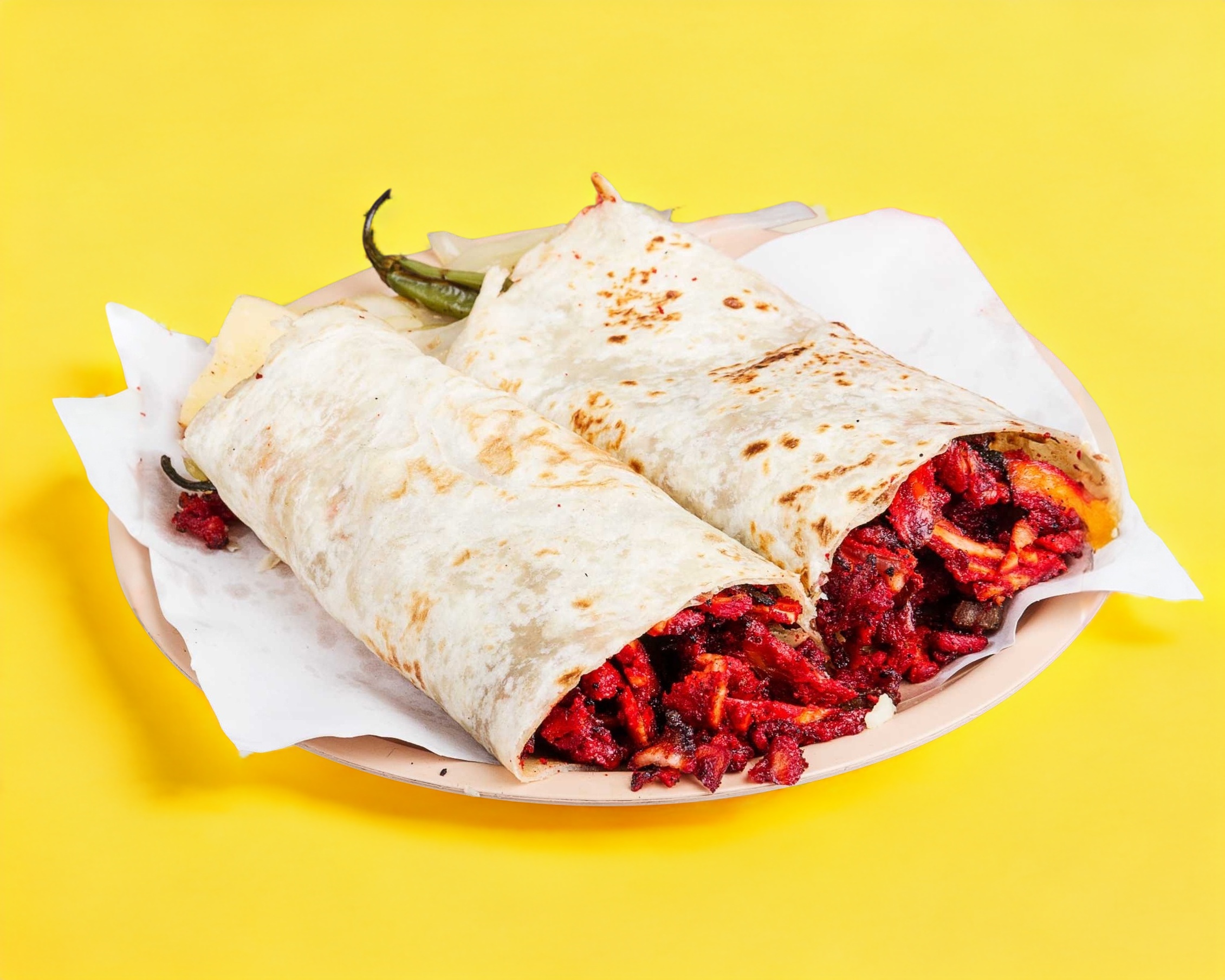 5 tacos de trompo con su exquisita carne de trompo, limones, salsa y cebolla.
