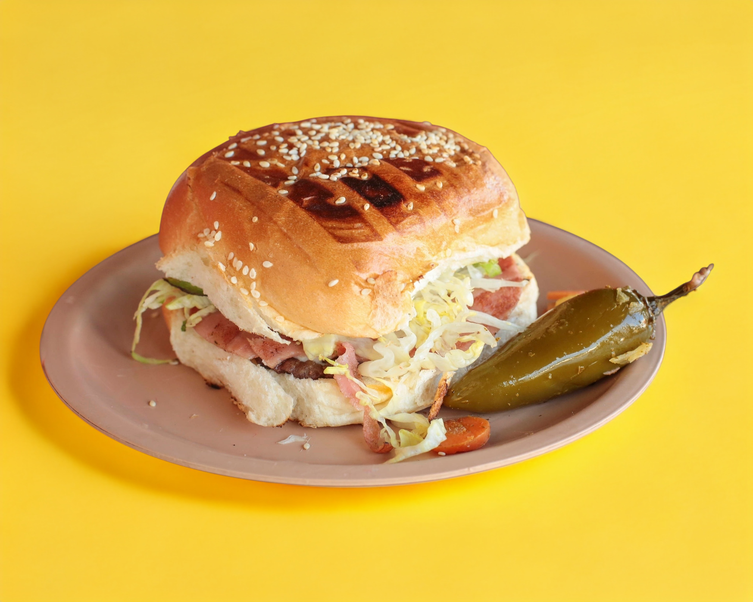 Pan de telera con bistec, mayonesa y crema, queso, tomate,aguacate y lechuga.