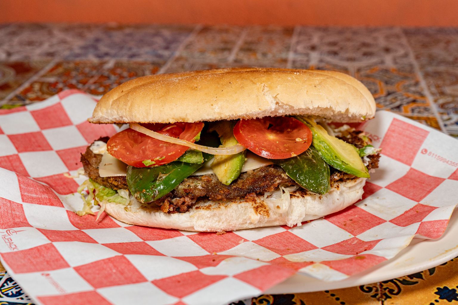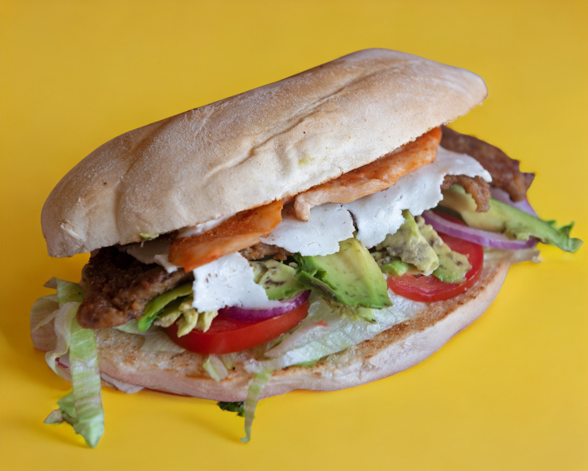 Milanesa,queso blanco y tocino frijol,lechuga cebolla,tomate,aguacate y mayonesa