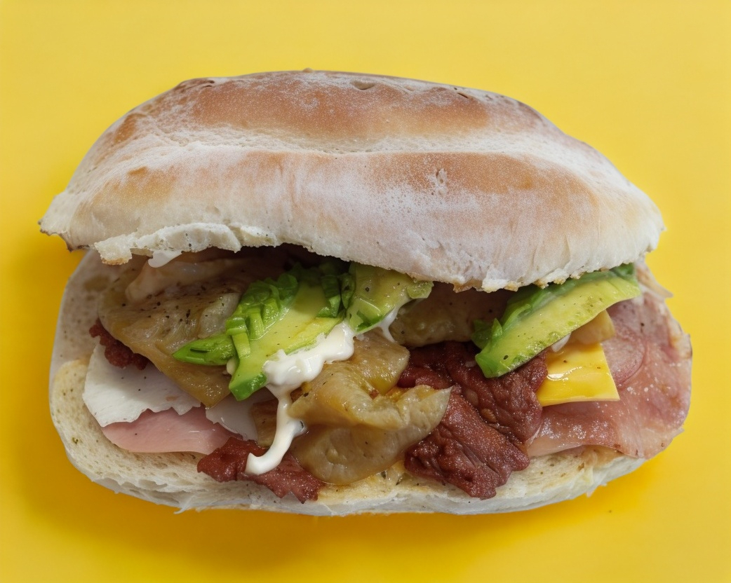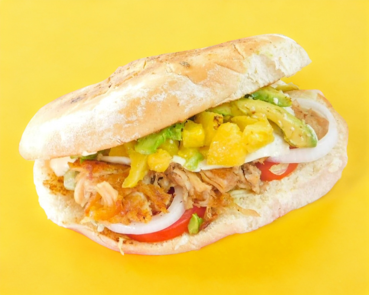 Pollo, jamón y queso amarillo. frijol,lechuga cebolla,tomate,aguacate y mayonesa