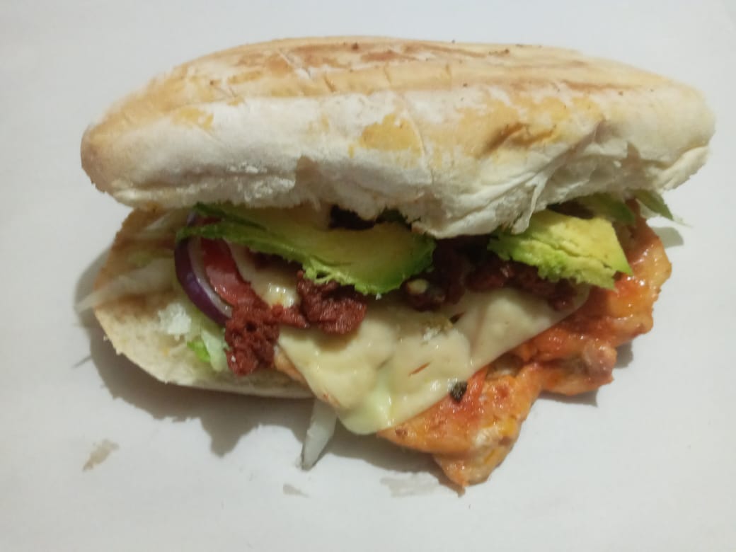 Milanesa ,queso y chile en rajas frijol,lechuga cebolla,tomate,aguacate y mayonesa