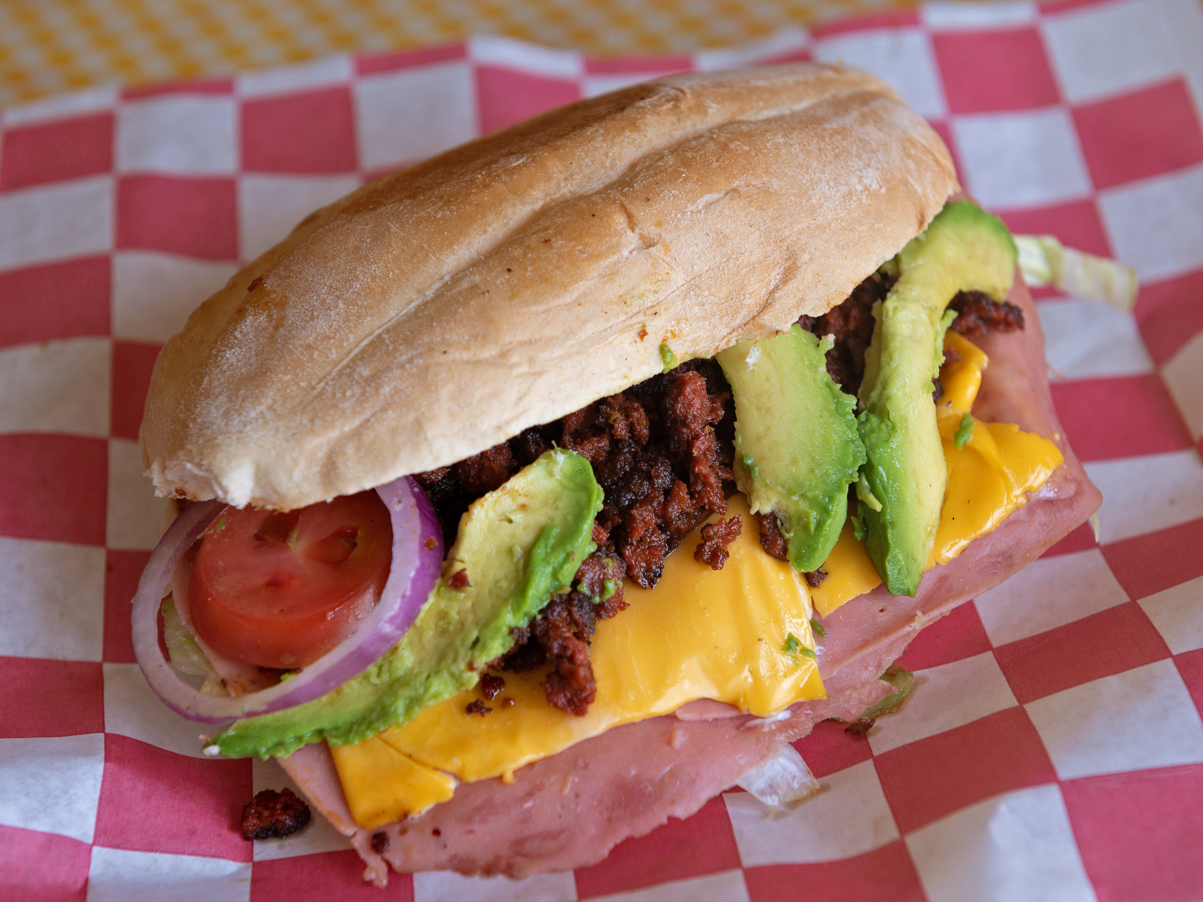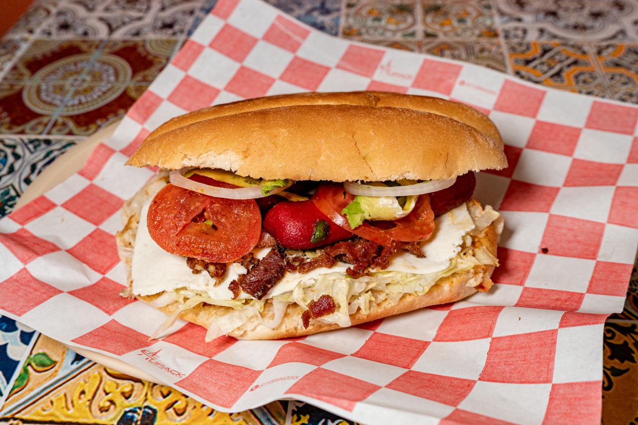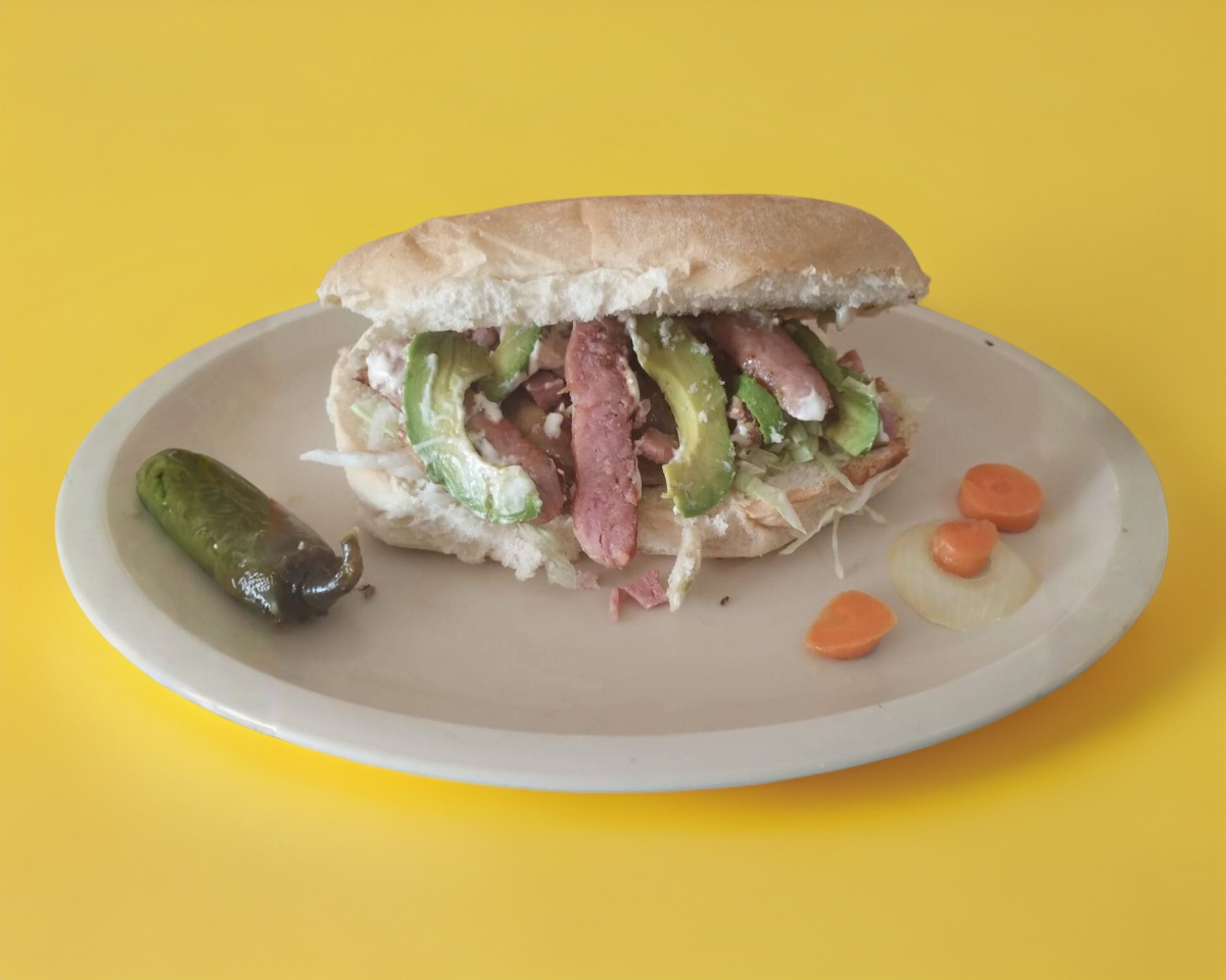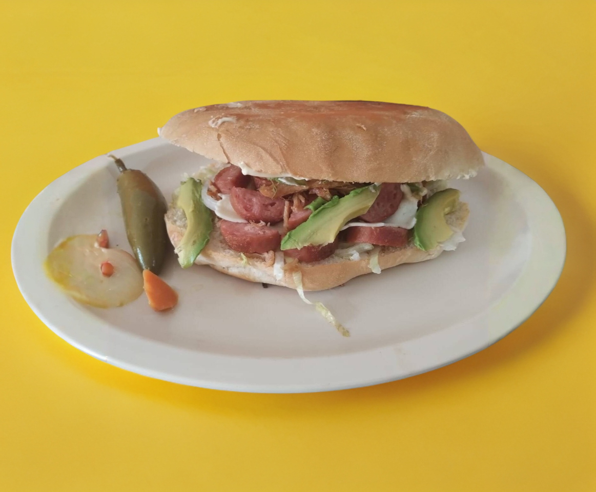 Jamón, queso amarillo y chorizo. frijol,lechuga cebolla,tomate,aguacate y mayonesa