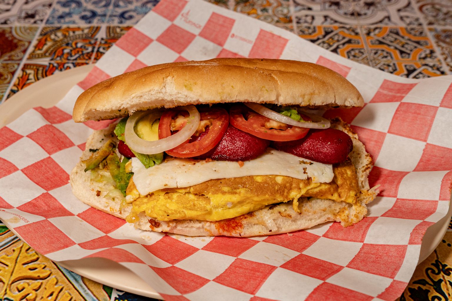 Huevo, salchicha y queso panela. frijol,lechuga cebolla,tomate,aguacate y mayonesa