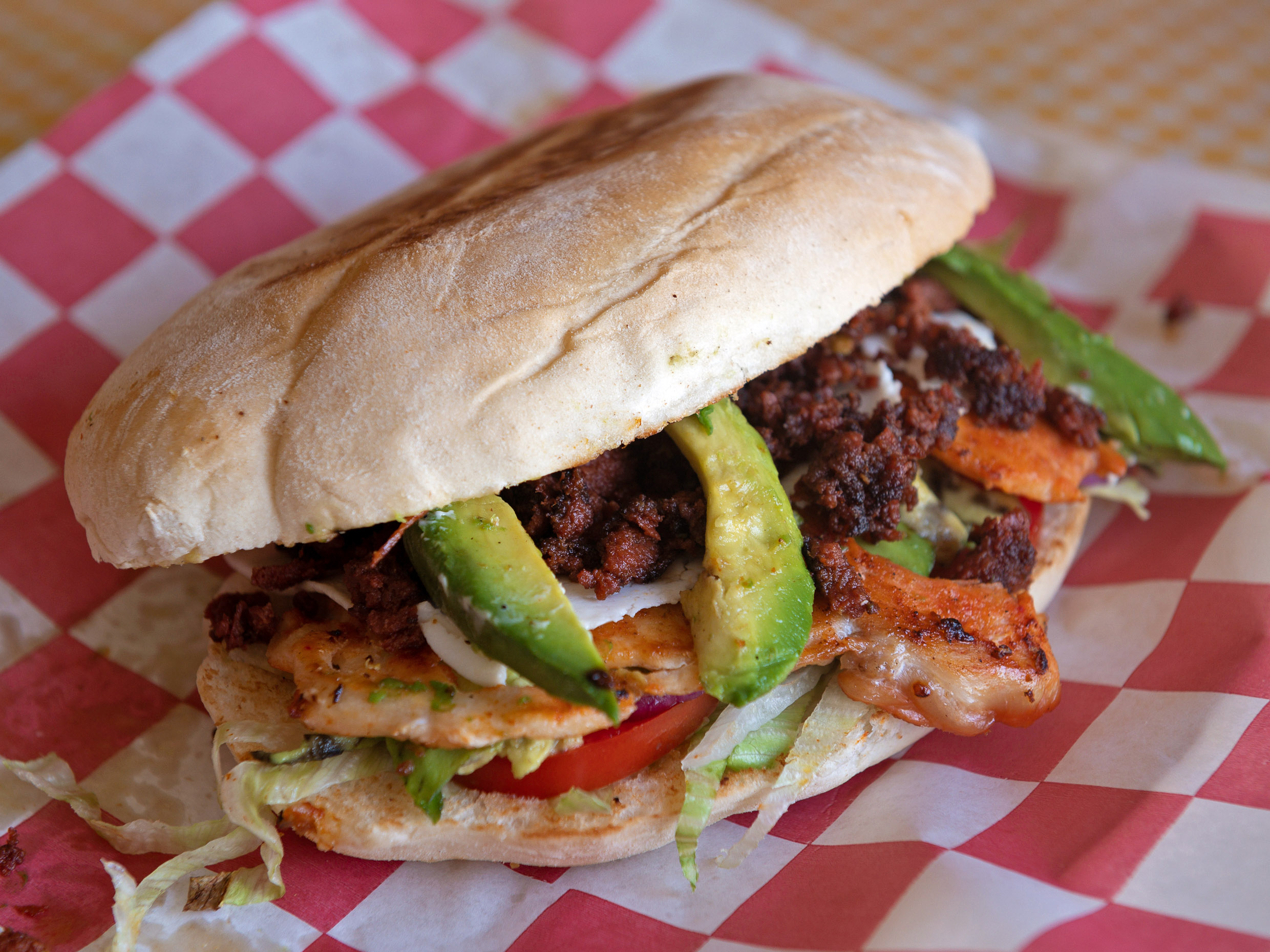 Pollo, chorizo y queso manchego. frijol,lechuga cebolla,tomate,aguacate y mayonesa