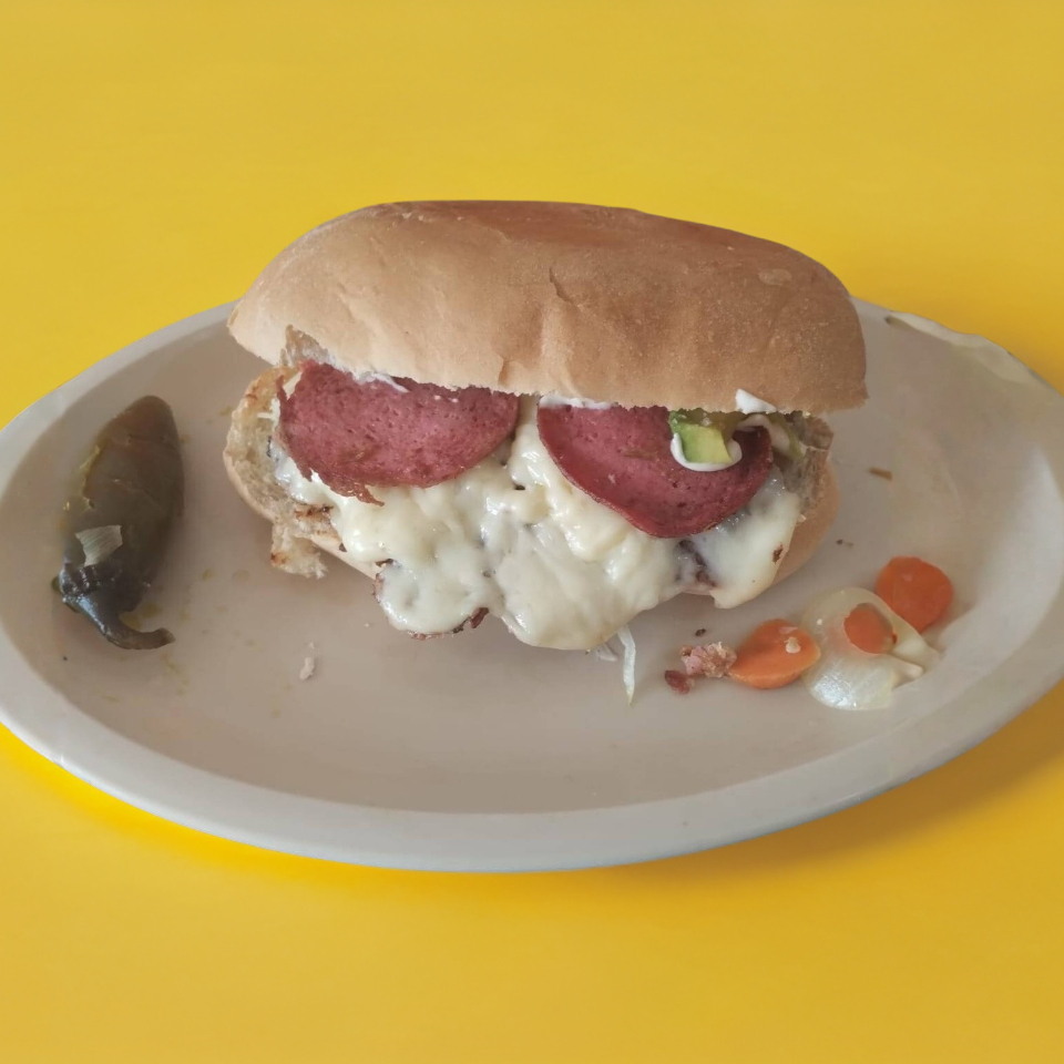 Pierna, manchego y salami frijol,lechuga cebolla,tomate,aguacate y mayonesa