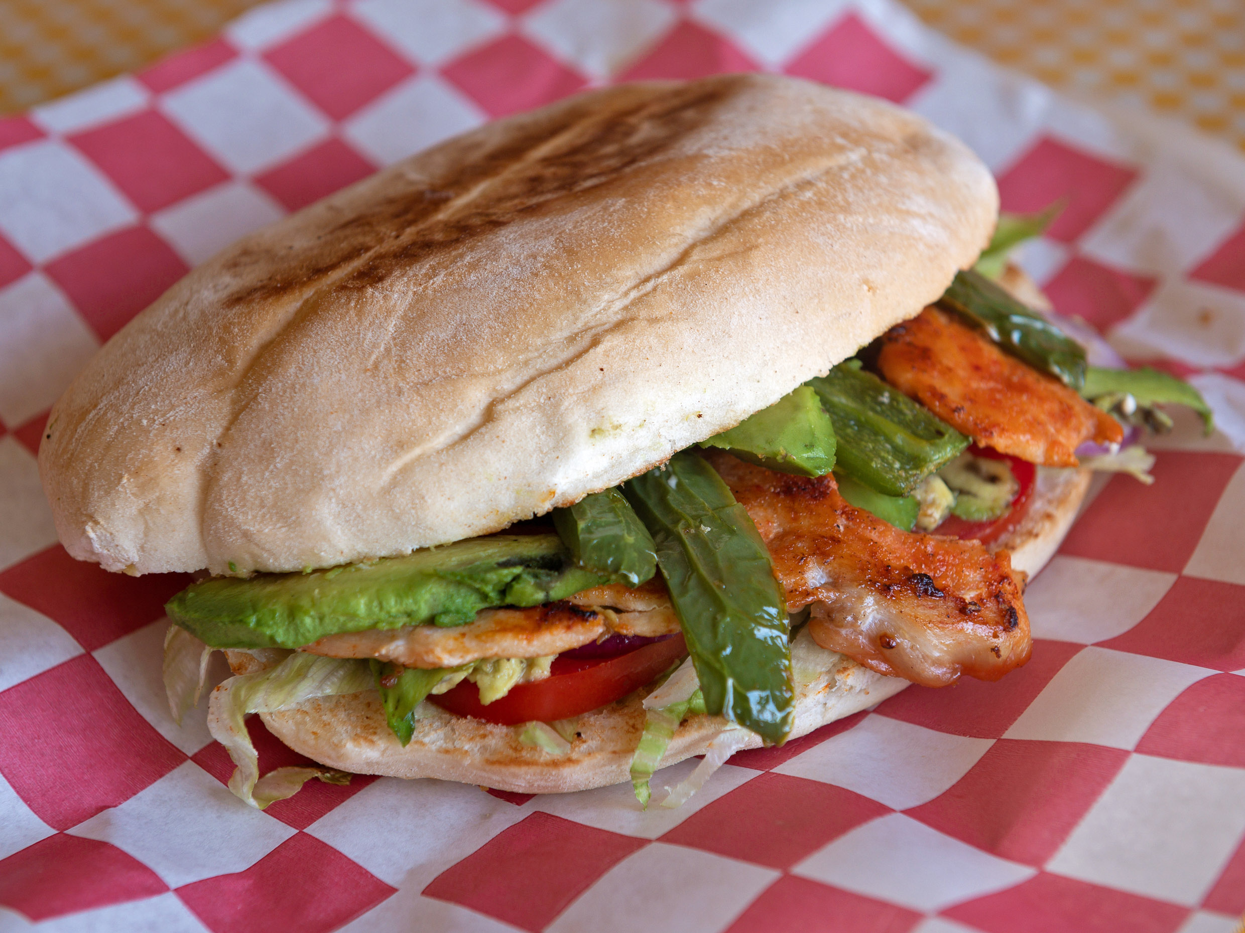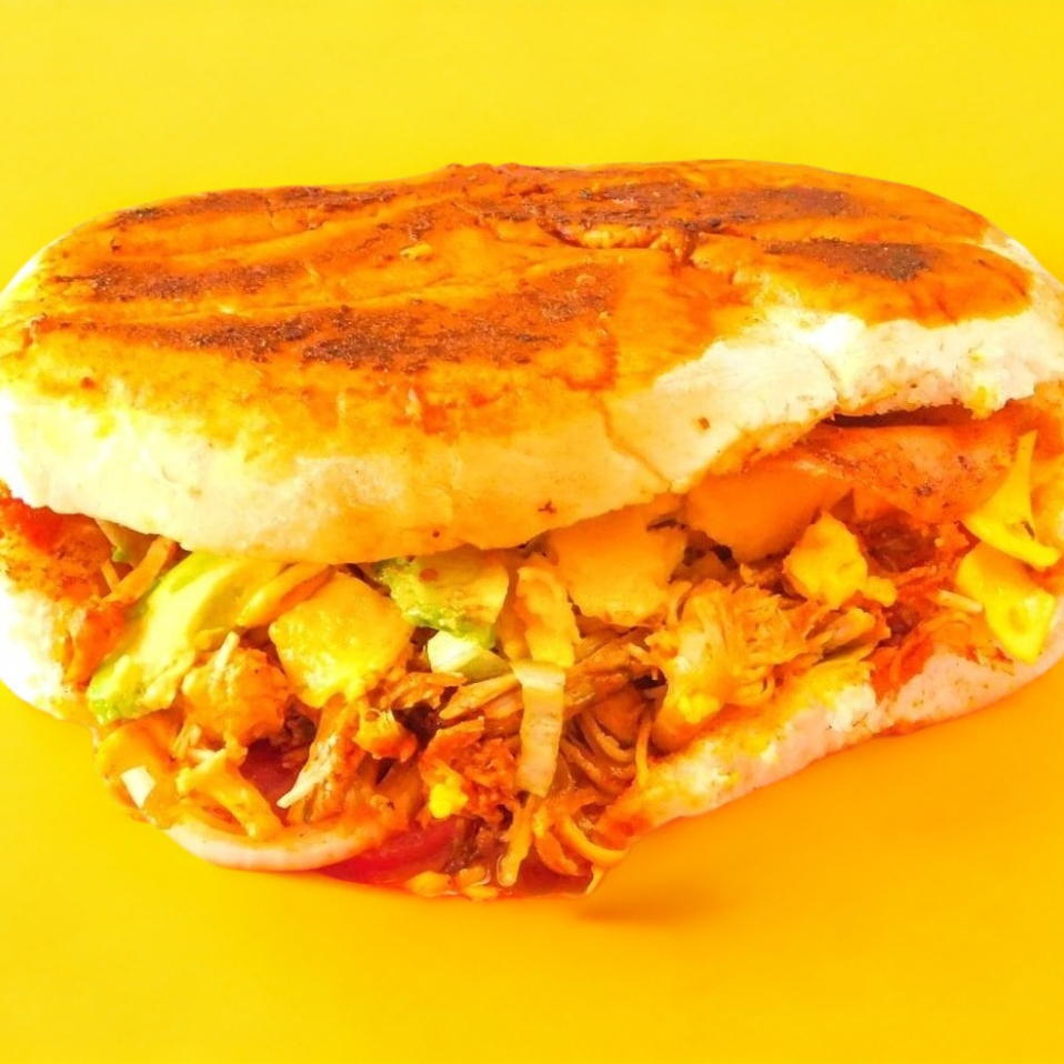 Pollo, tocino y queso panela. frijol,lechuga cebolla,tomate,aguacate y mayonesa