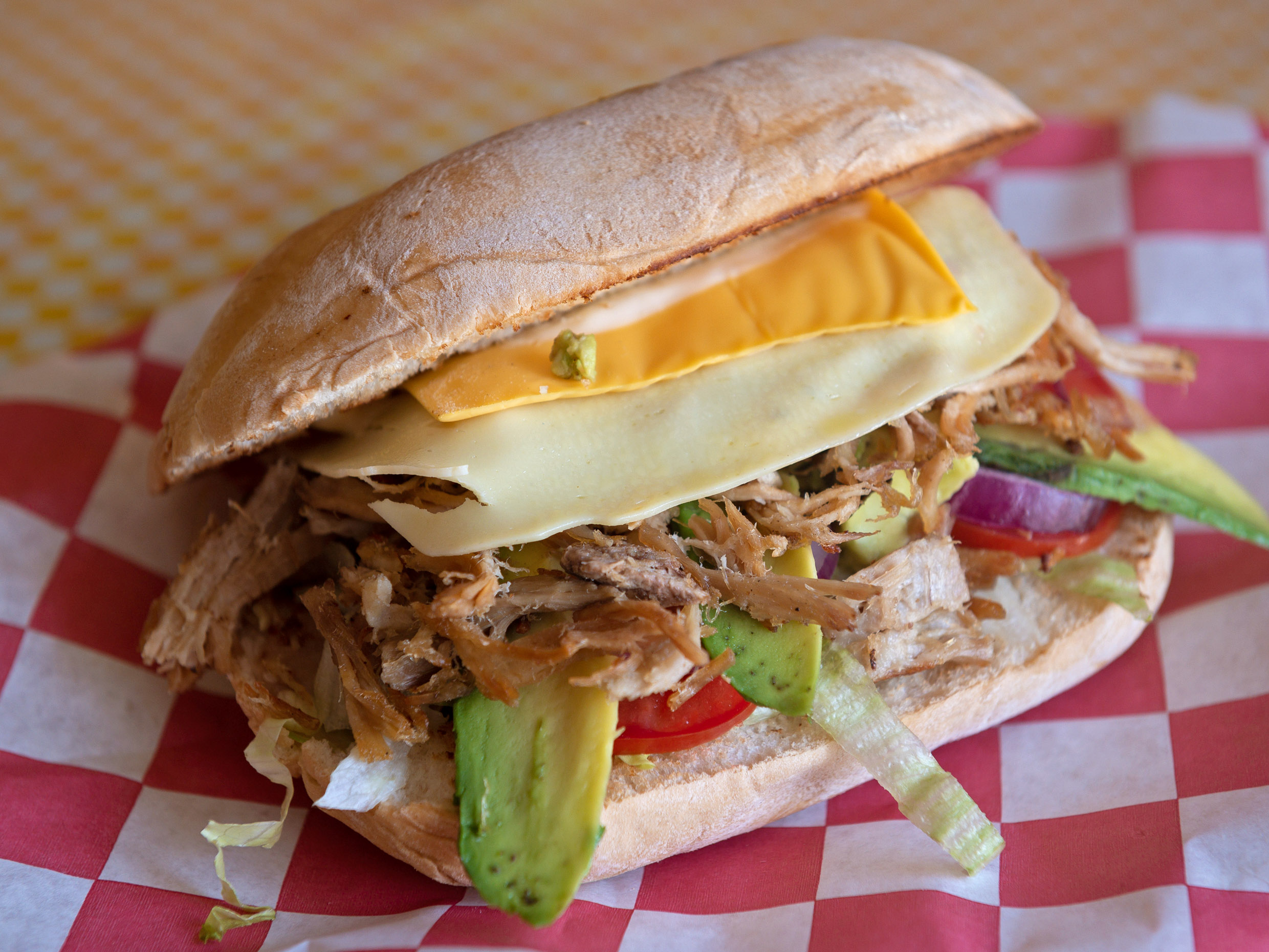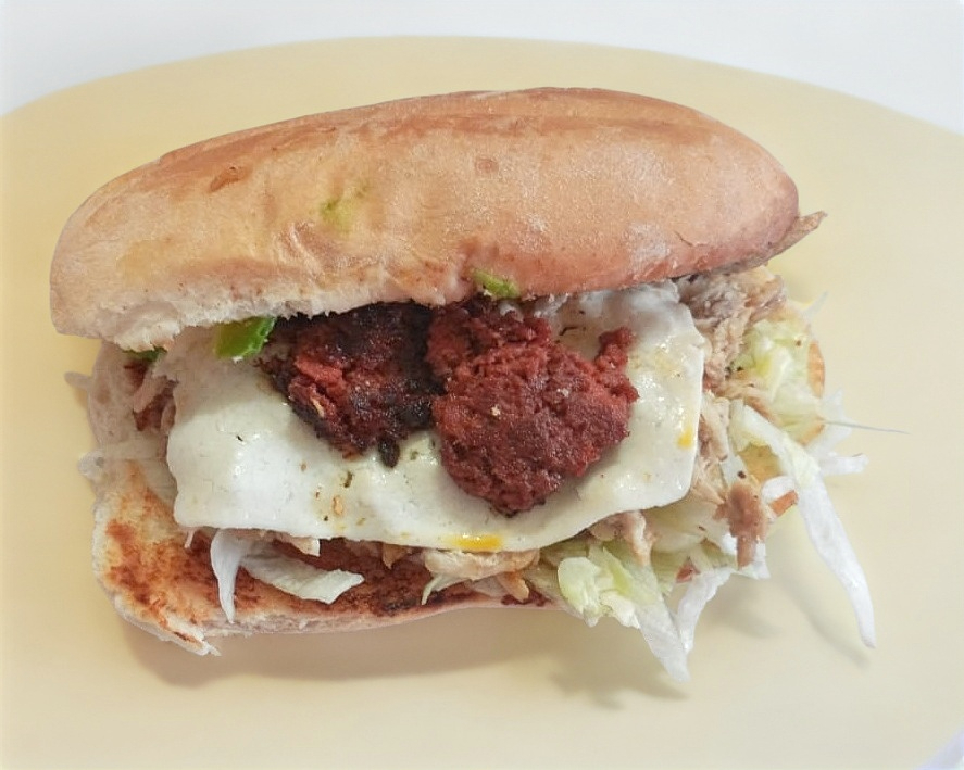 Jamón, queso puerco, amarillo y panela. frijol,lechuga cebolla,tomate,aguacate y mayonesa