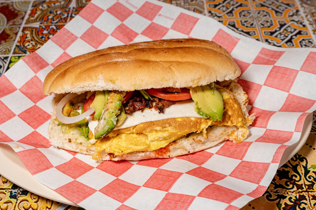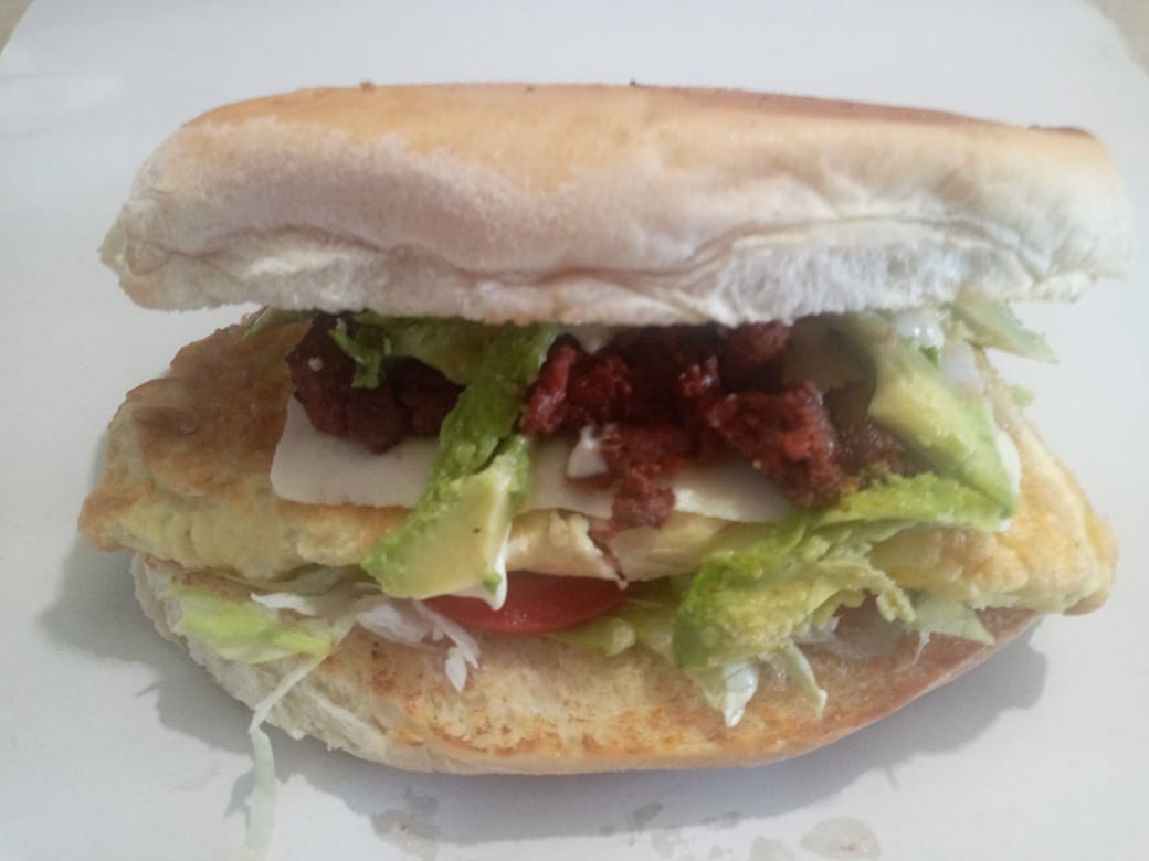 Huevo, salami y manchego. frijol,lechuga cebolla,tomate,aguacate y mayonesa