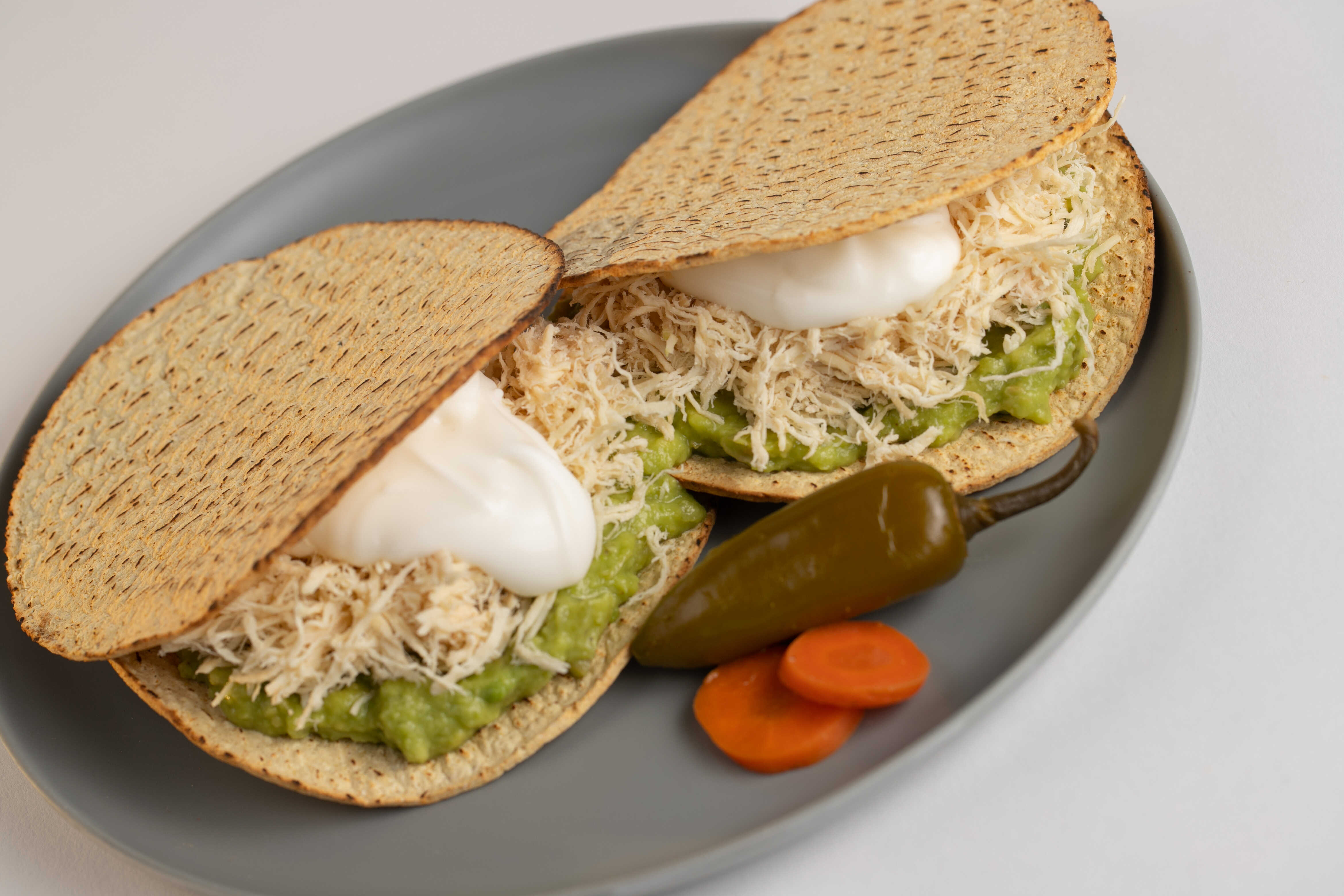 2 tostadas especiales con guacamole, pechuga de pollo desmenuzada y crema.