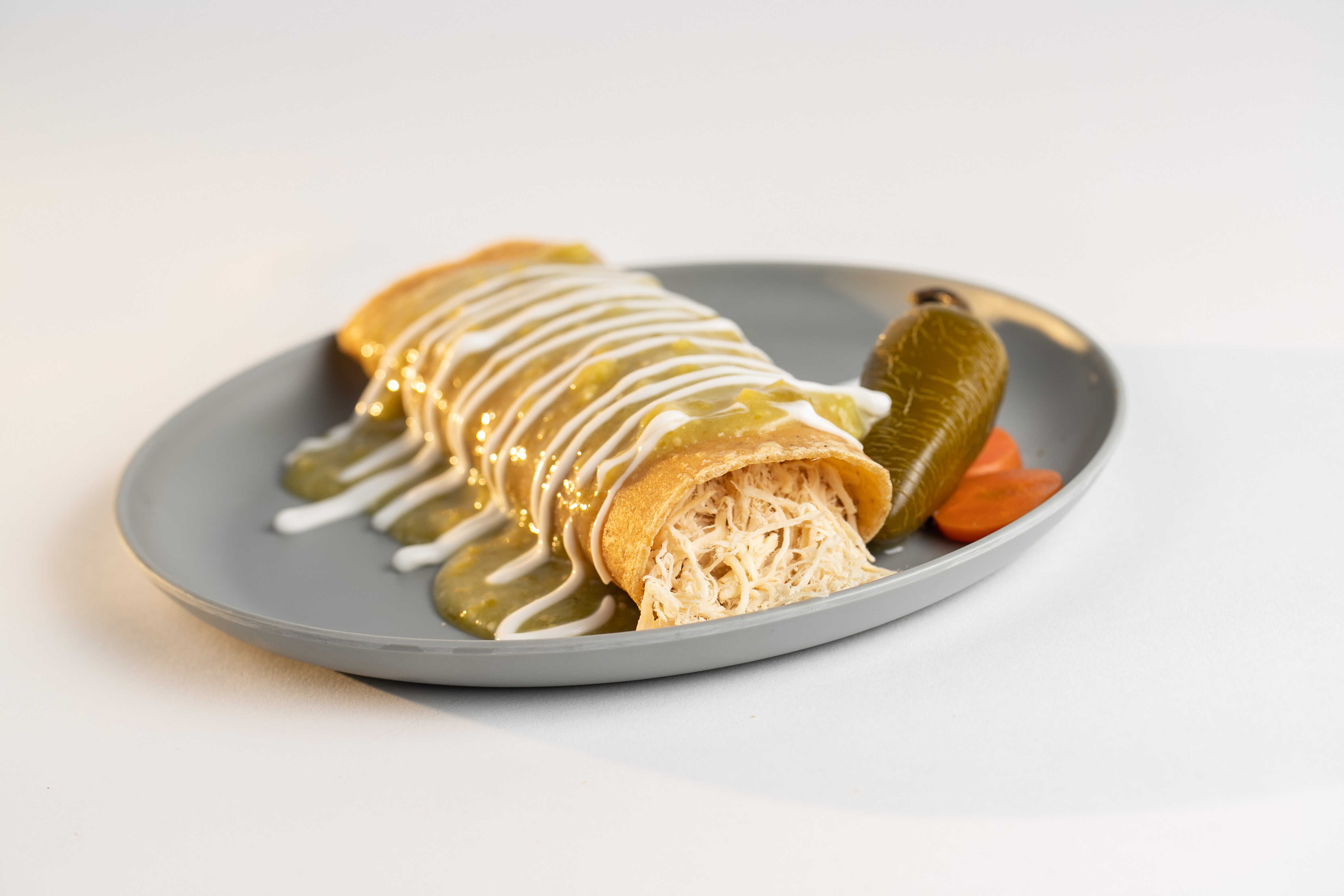 Bañadas en nuestra Salsa de Guacamole con Crema, servidas con Lechuga, Tomate y una porcion de Arroz.