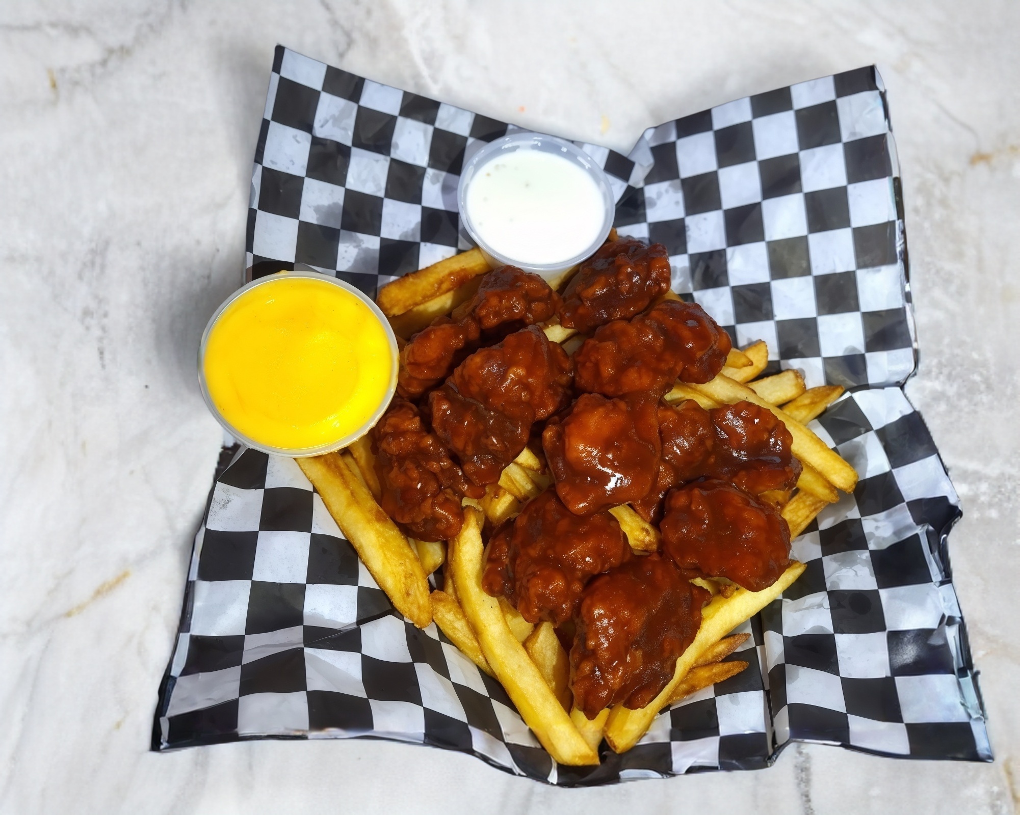 Orden de papas grandes , más 250 gramos de boneless acompañados de aderezo,queso cheddar y Catsup