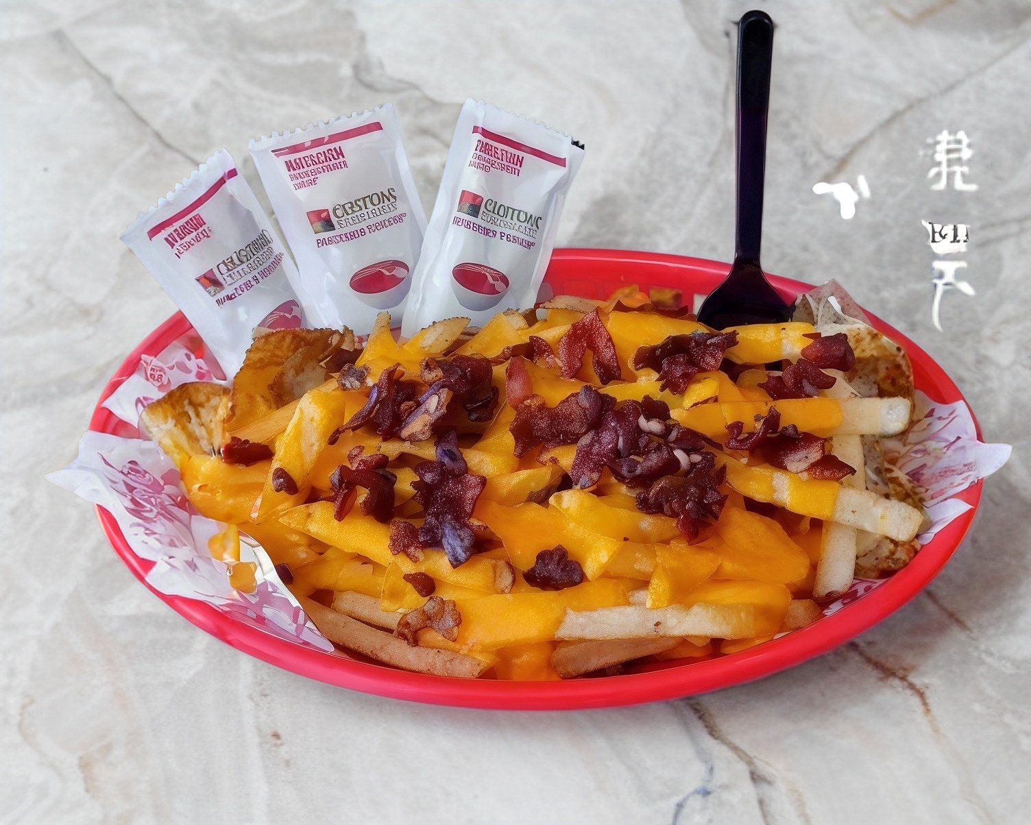 Papas fritas con queso cheddar y tocino ahumado natural.