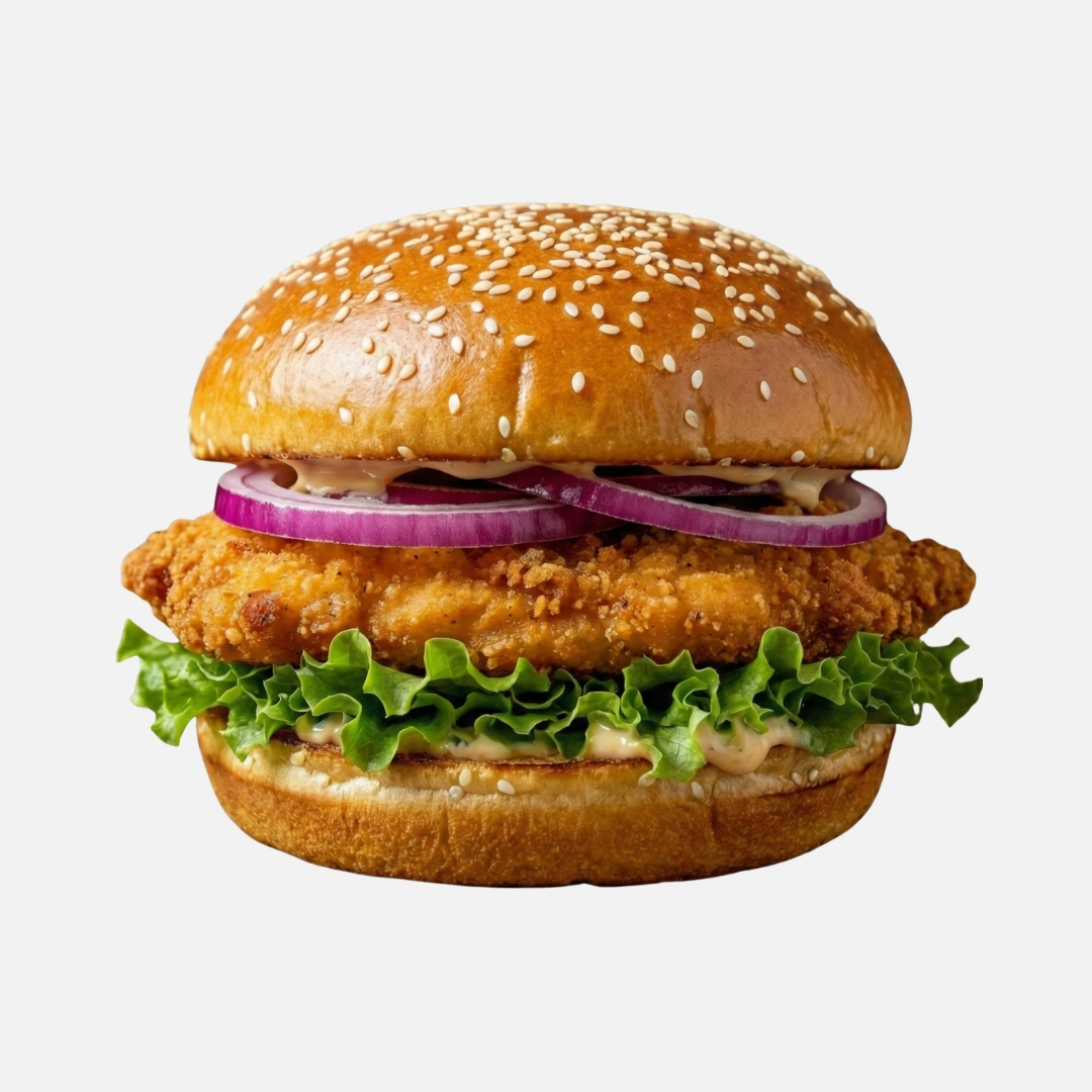 Hamburguesa 100% pechuga de pollo empanizada, mayonesa, pepinillos, lechuga cebolla morada y jalapeños, con un toque de salsa bbq, bufalo, chipotle o ranch