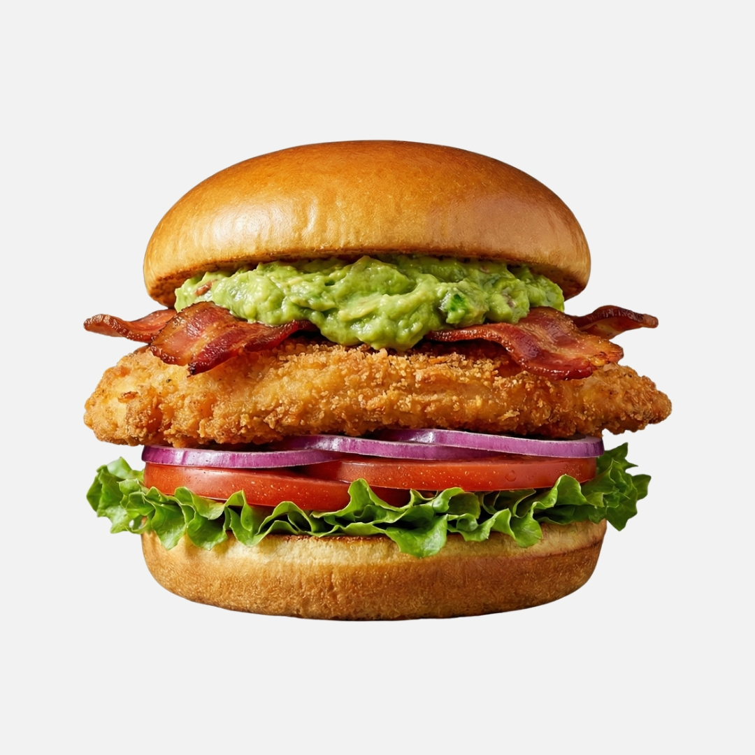 Hamburguesa de pechuga de pollo empanizado, mostaza y catsup, pepinillos, tomate, cebolla morada, lechuga exquisito guacamole puro, tocino frito y un toque de aderezo ranch