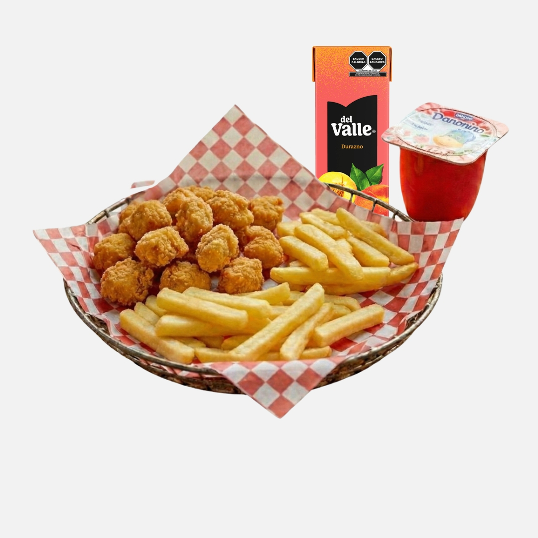 150 gms de nuggets acompañados de papas fritas, jugo y postre