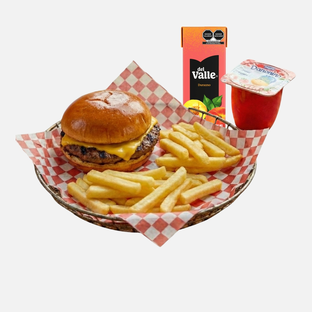 Combo de hamburguesa con queso acompañada de papas fritas, jugo y postre