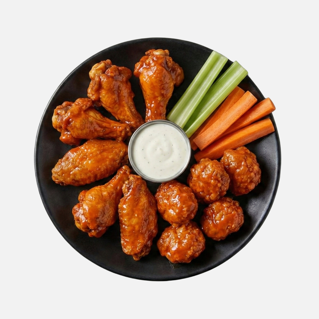 150 Gramos de boneless junto con 250 gramos de alitas acompañados de verdura y aderezos.