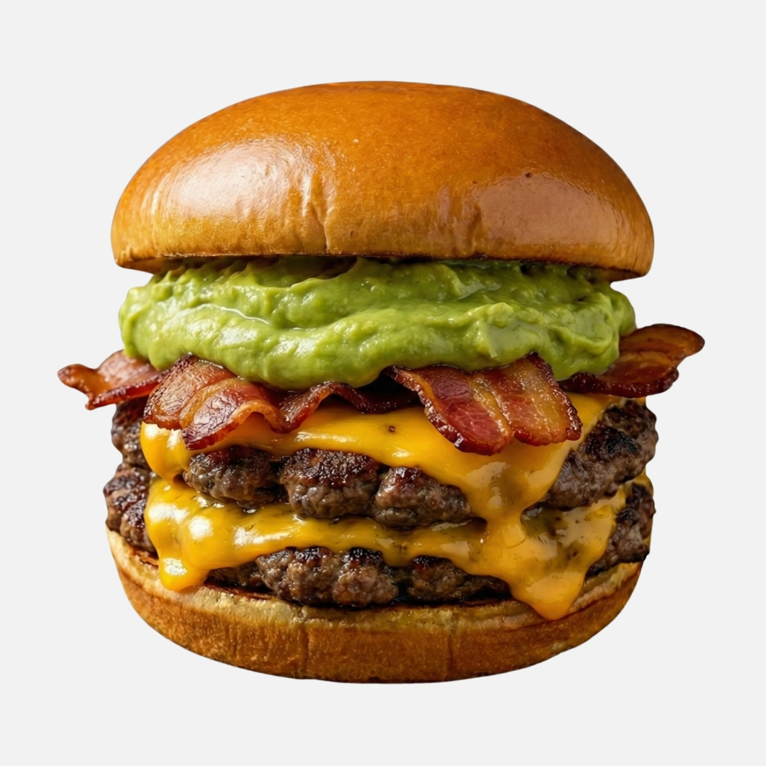 Hamburguesa doble carne de res, queso americano, tocino crujiente y guacamole 100% natural