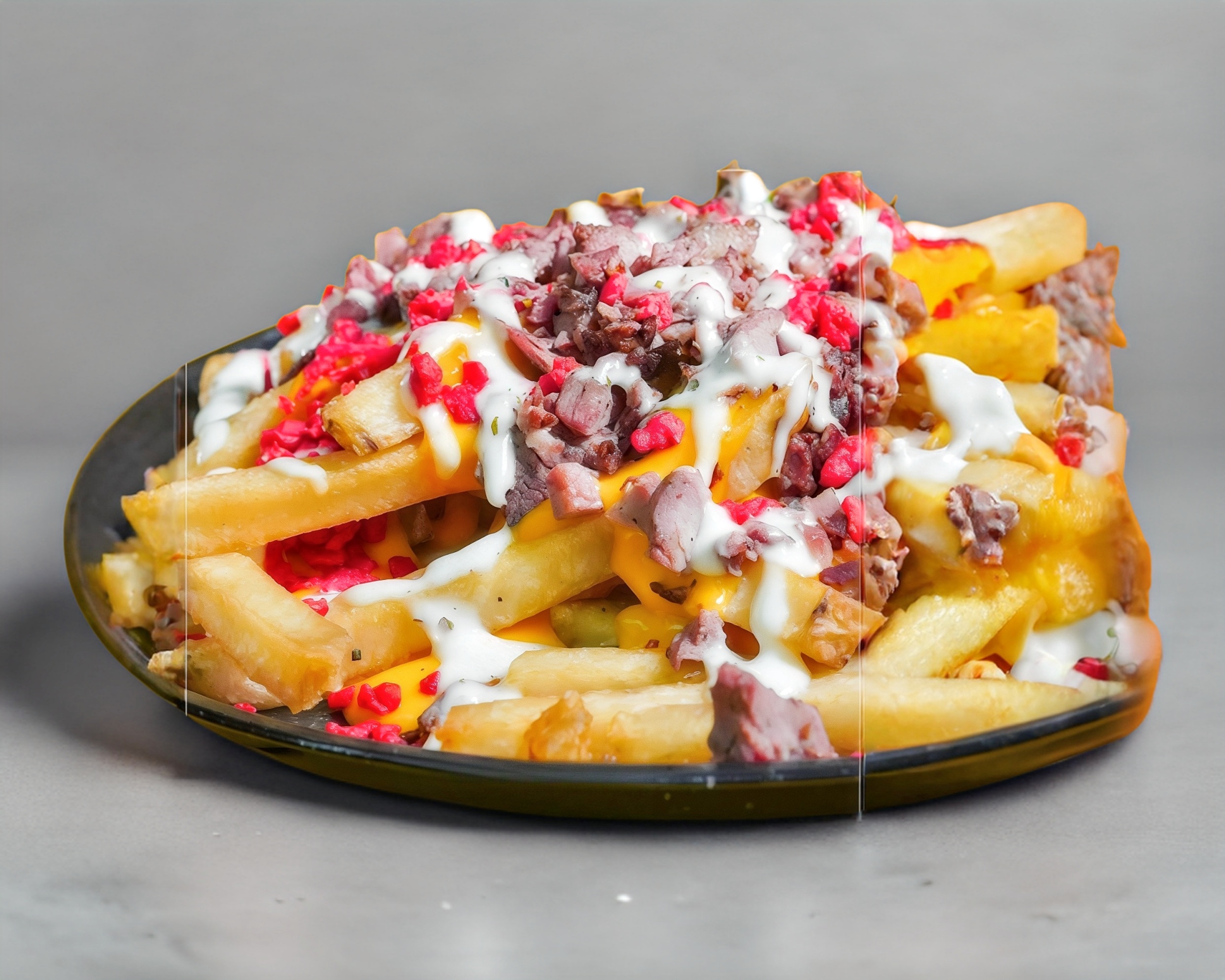 papas bañadas con salsa de queso amarillo, aderezo ranch, carne asada y tocino deshidratado