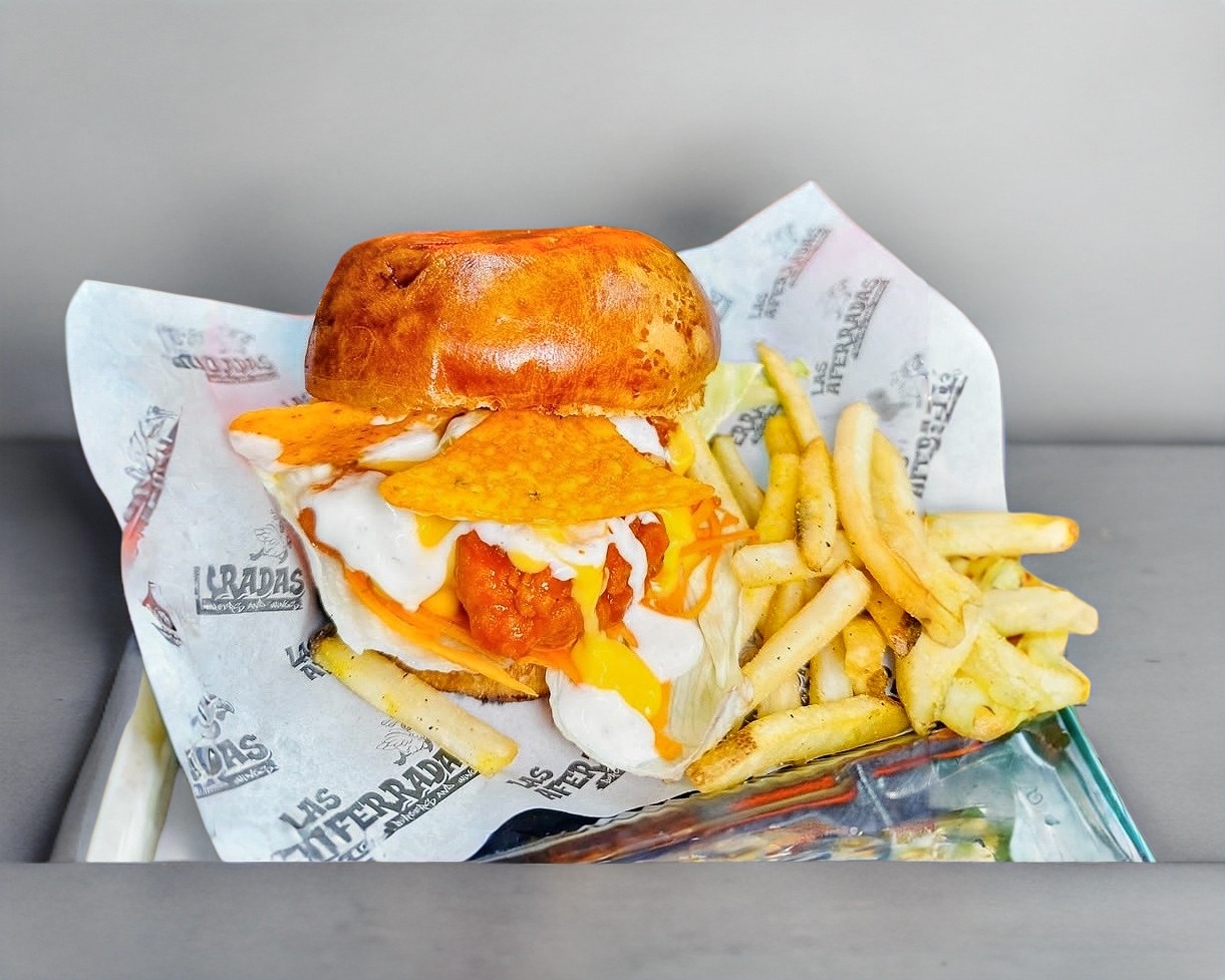Boneless de pollo bañados en salsa al gusto (bufalo, bbq, hot bbq, mango habaero, salsa de la casa) doritos nachos, queso amarillo, lechuga zanahoria, aderezo chipotle, aderezo ranch y papas