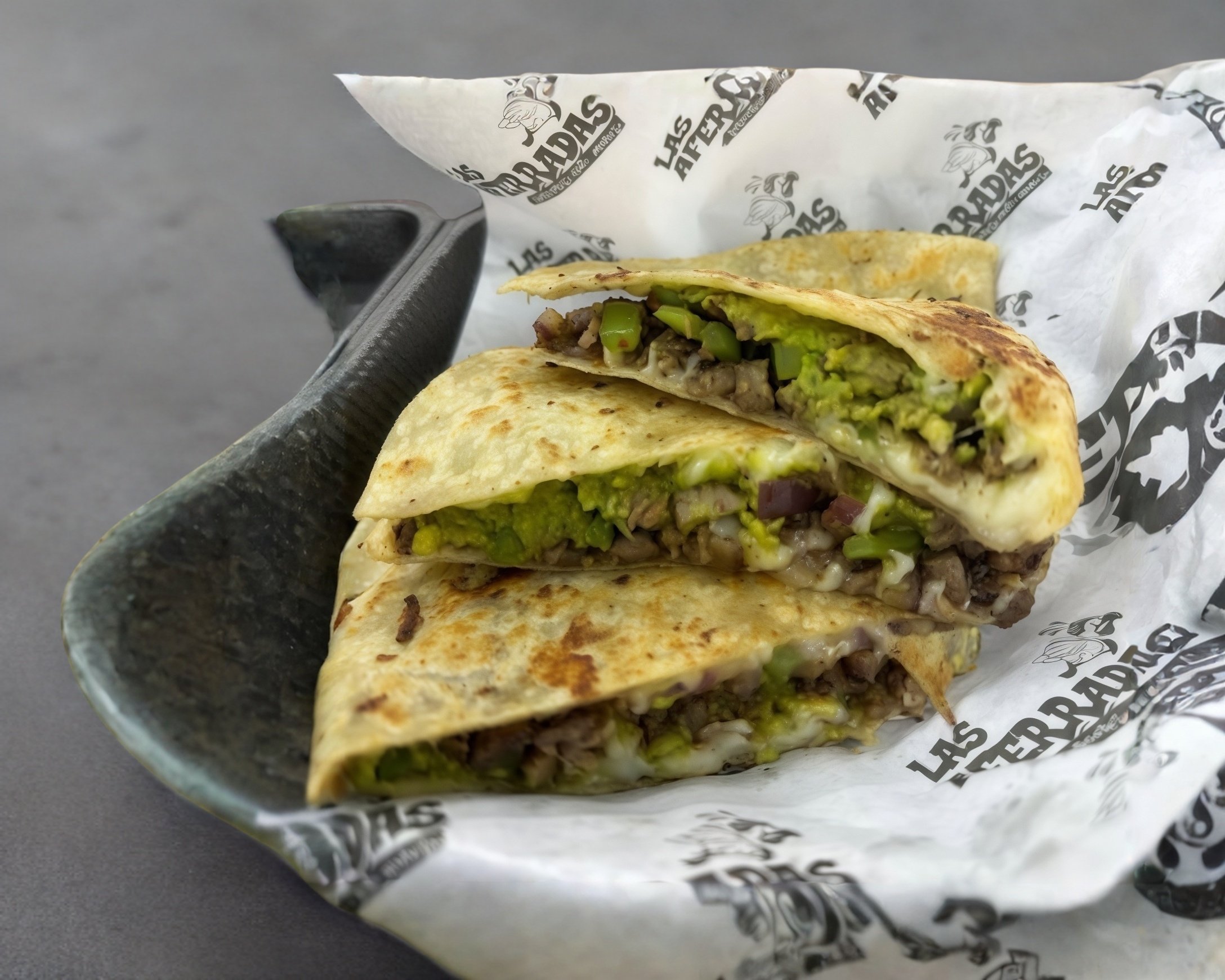 Relleno de carne , queso manchego, aguacate y aderezos.