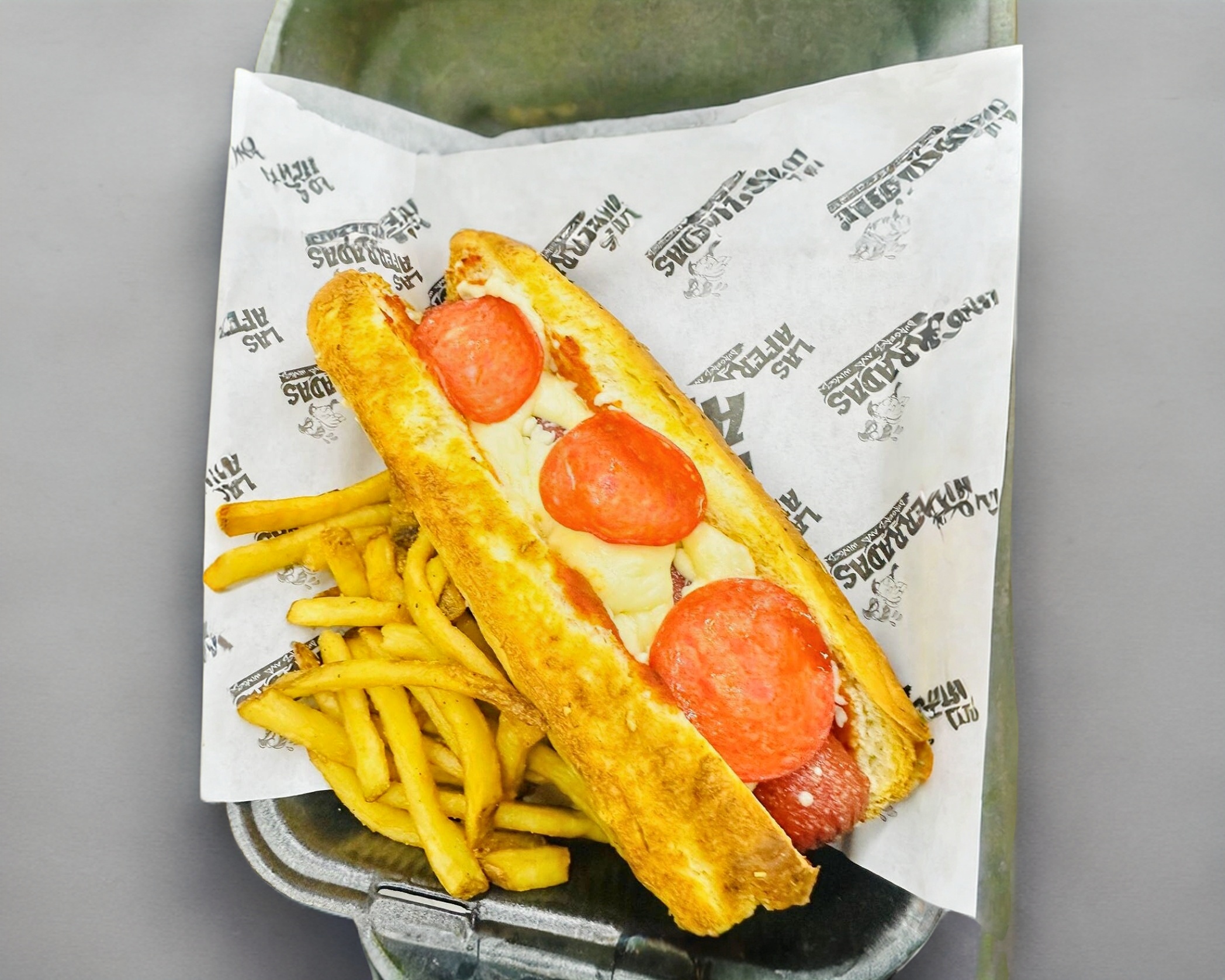 Salchicha de pavo, con salsa para pizza, queso mozzarella, peperioni, chile quebrado, aderezo y papas