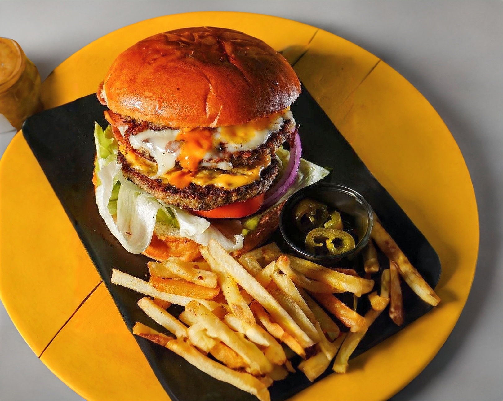 Carne doble jugosa, doble cama de queso asadero, doble jamon, tomate cebolla morada, lechuga, aguacate aderezo y papas