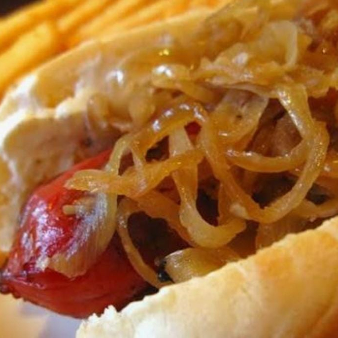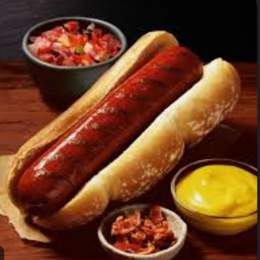 Pan de hot dog , salchicha roja, cebolla asada mayonesa mostaza catsup.