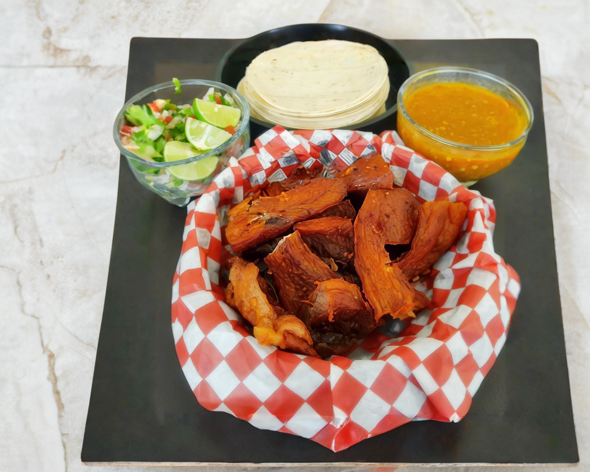 1 Kg de cachete, tortillas, salsa, pico de gallo y limones. Incluye PEPSI 2 lts.