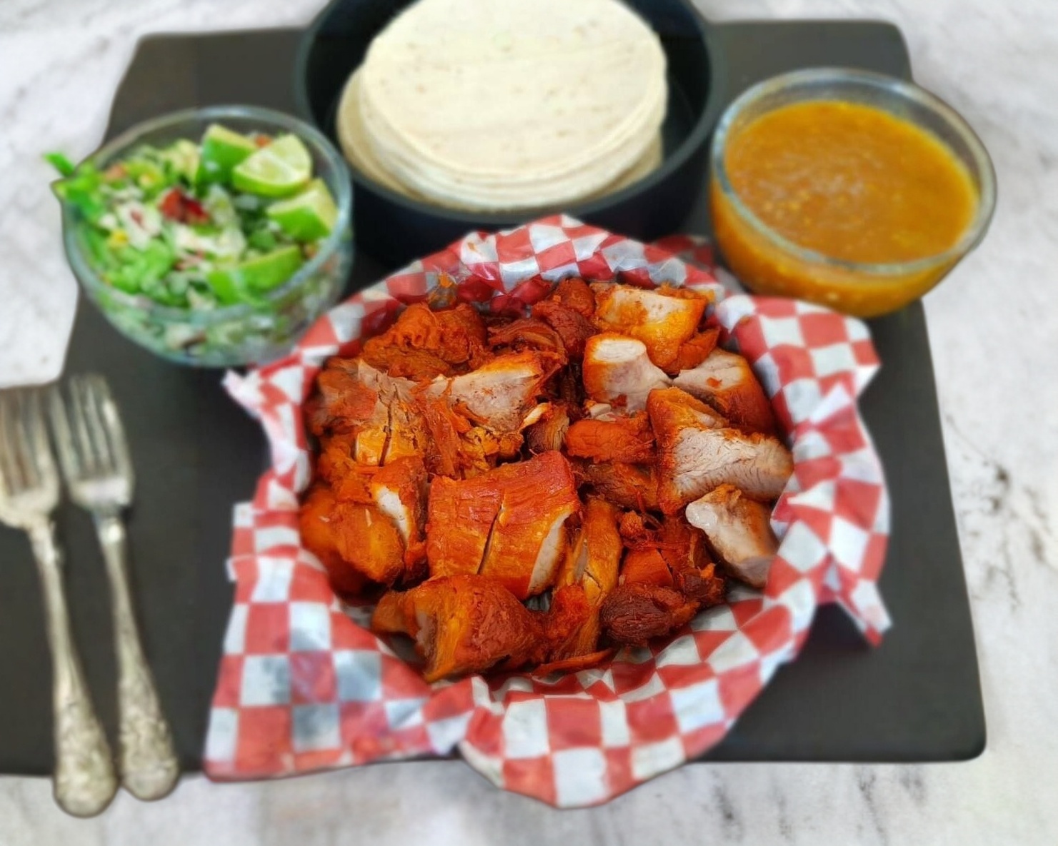 1 Kg de carnitas, tortillas, salsa, pico de gallo y limones. Incluye PEPSI 2 lts.