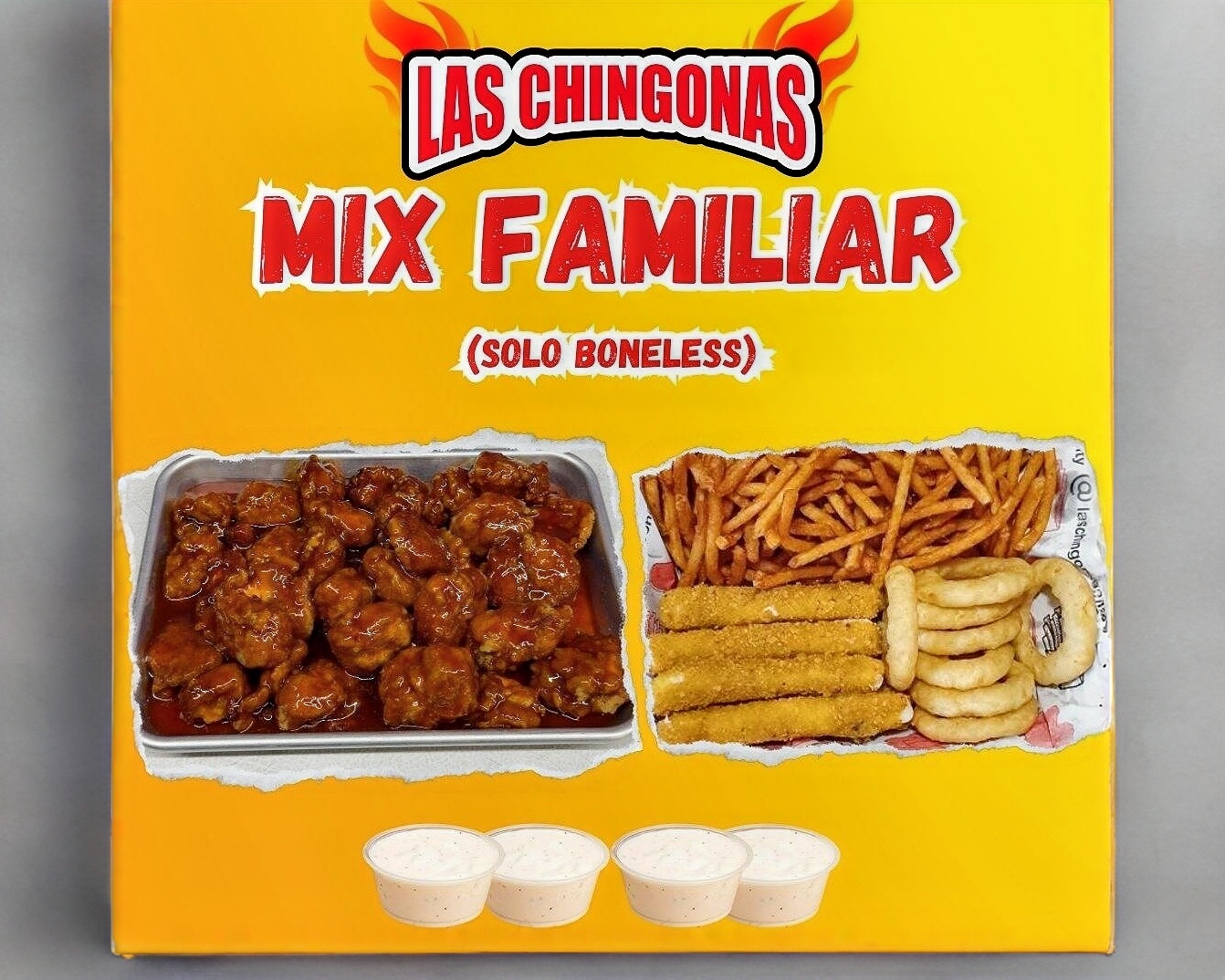 1 k de Boneless, Papas, 8 Dedos de Queso, 8 Aros de Cebolla y 4 adrezos Ranch