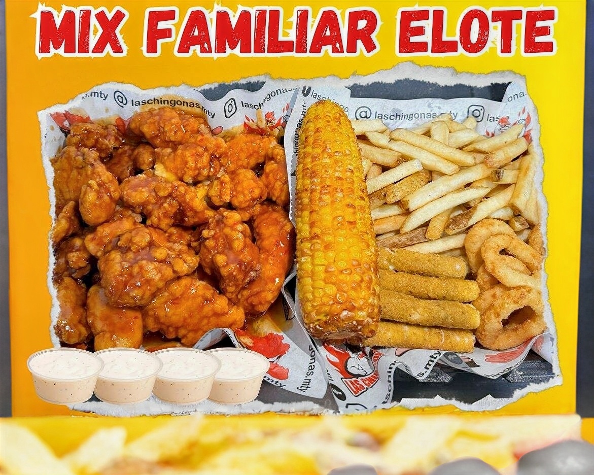 2 kilo de Boneless,10 dedos de queso, 16 aros de cebolla papas a la francesa 4 elotes 8 Aderezos