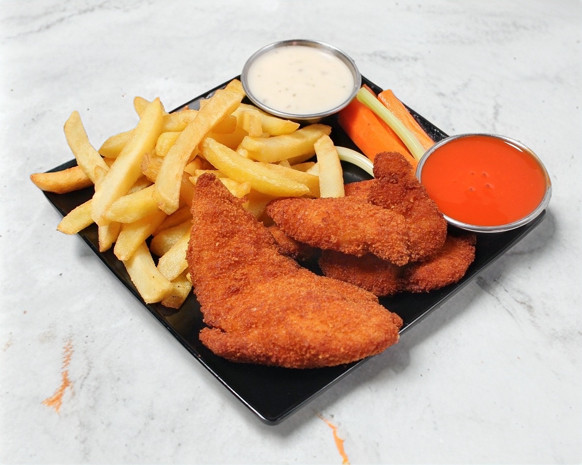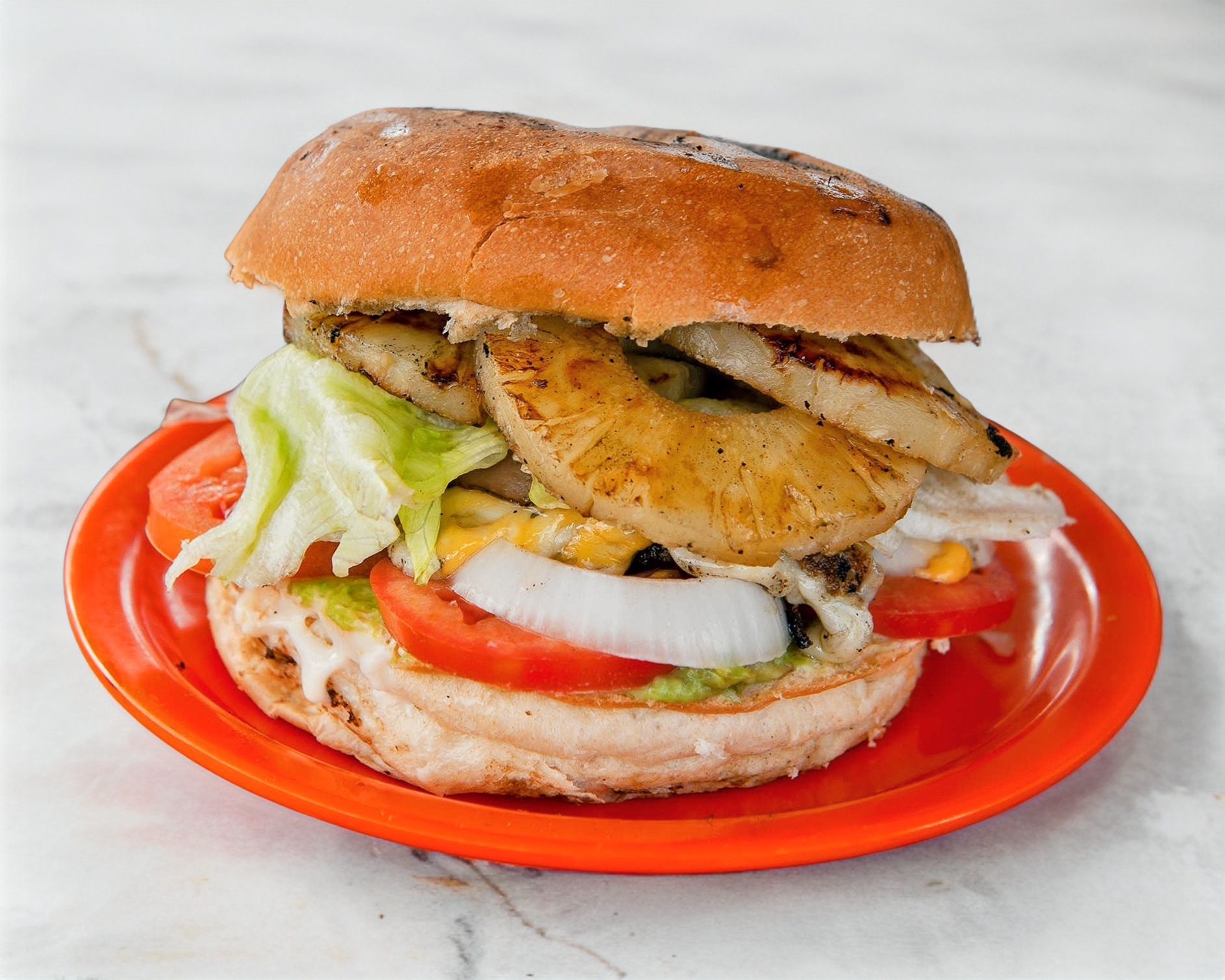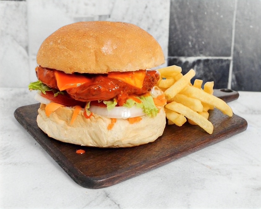 Pechuga empanizada y bañadas en salsa al gusto,queso americano,lechuga,tomate y cebolla,acompañada de papas a la francesa.