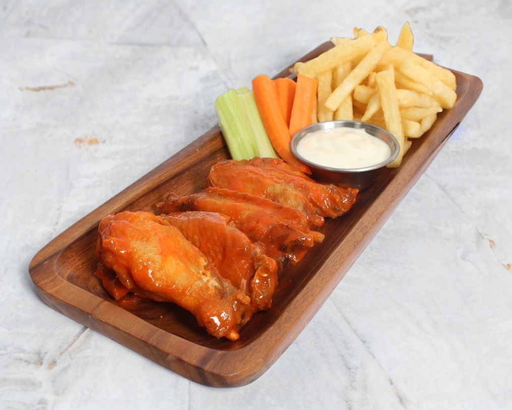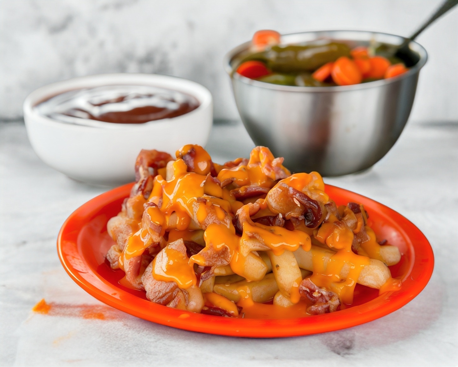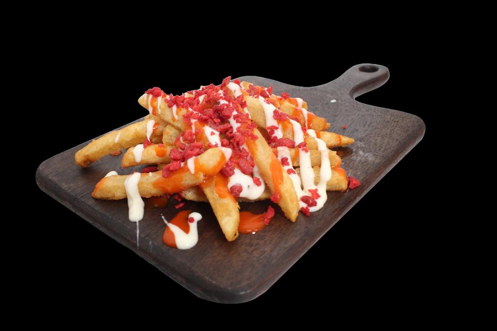 300 gr de papas a la francesas,bañadas en la salsa de tu elección,lineas de aderezo ranch y tocino.