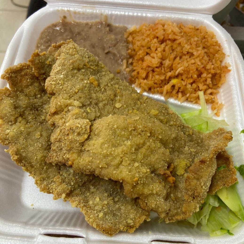 1 porción de Milanesa de pollo (1 pieza empanizado y freído) , acompañada de puré de papa, espagueti blanco, 5 tortillas de maíz y salsa ( salsa verde )