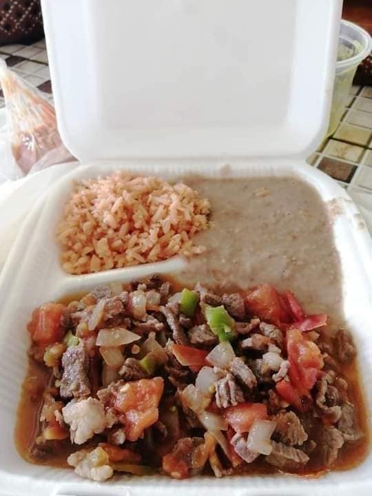 Carne 100%res en salsa de tomate, acompañado de arroz, frijoles, tortillas y salsa.