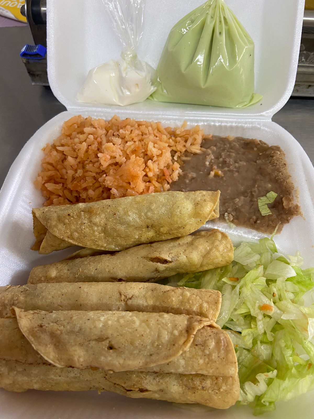 Acompañadas con arroz y frijoles, con una cama de lechuga tomate y cebolla junto con guacamole y crema.