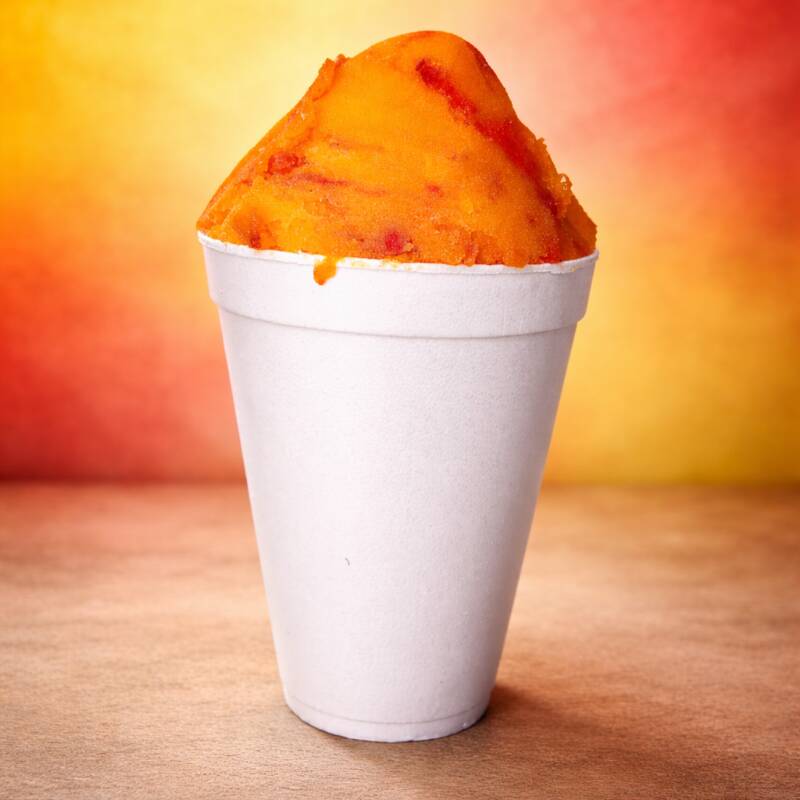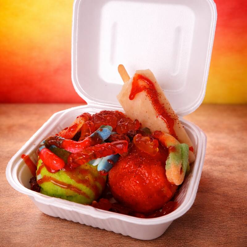 3 bolas de nieve a tu elección, chamoy, chile en polvo, una porción de gomitas y una paleta chica