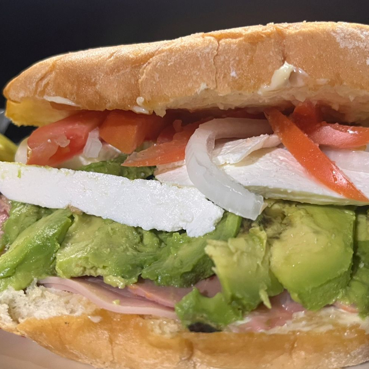 3 carnes frias jamon de pavo , pastel de pimiento , jamon de cerdo aguacate tomate cebolla y queso panela