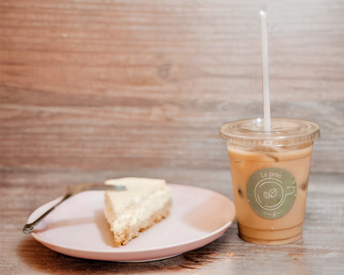 Rebanada de cheesecake Frambuesa y Café Expreso Vainilla latte.