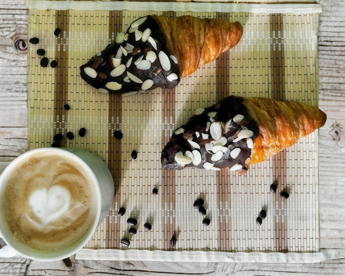 Café capuccino y delicioso medialuna, croissant de mantequilla cubierto con chocolate semi amargo, espolvoreado con almendras laminadas.