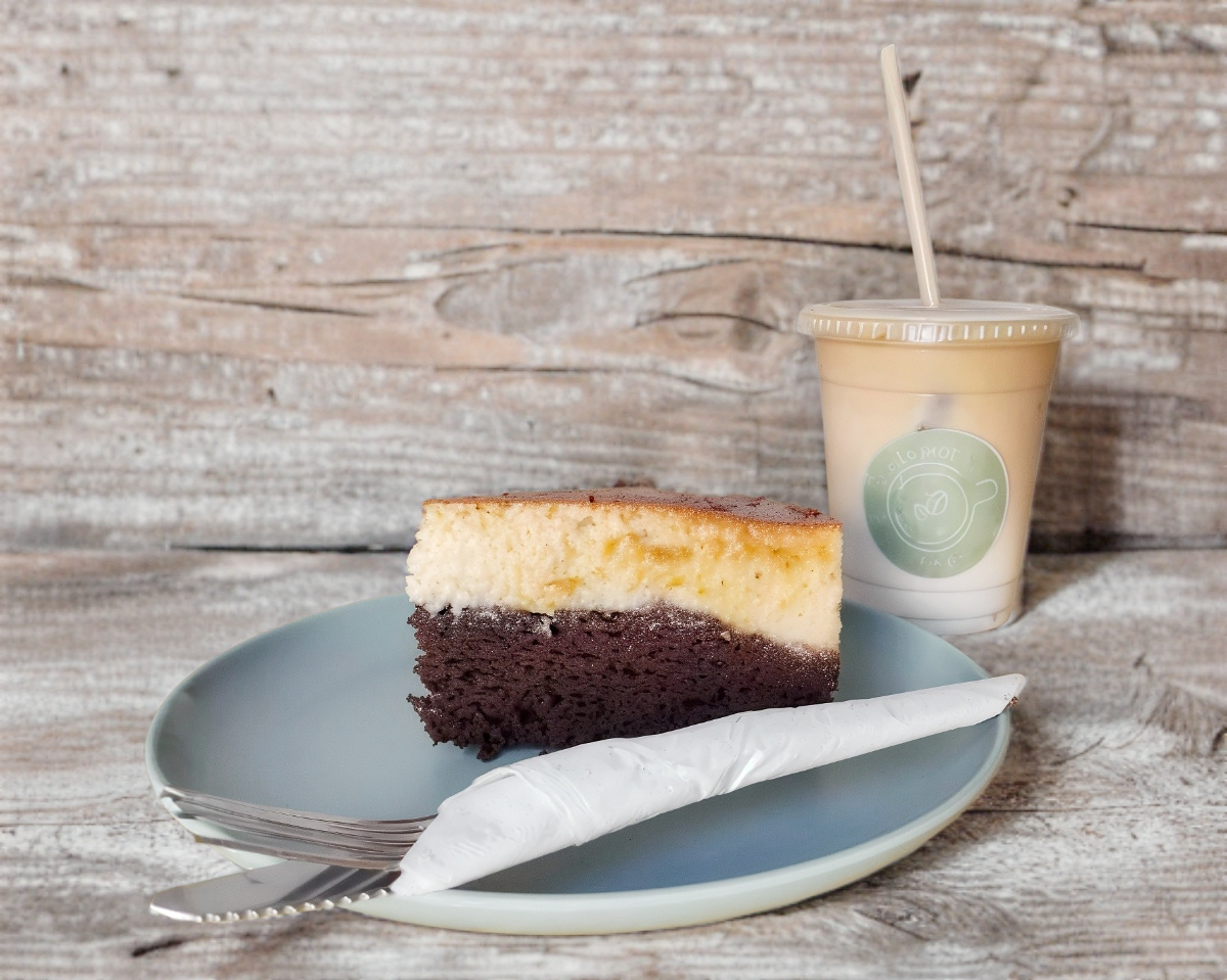Rebanada de pan de chocolate con flan napolitano sabor vainilla, cubierta de chocolate semiamargo y trocitos de nuez.