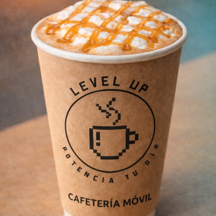 Café espresso con leche caliente, endulzado con jarabe de caramelo y una suave capa de espuma.